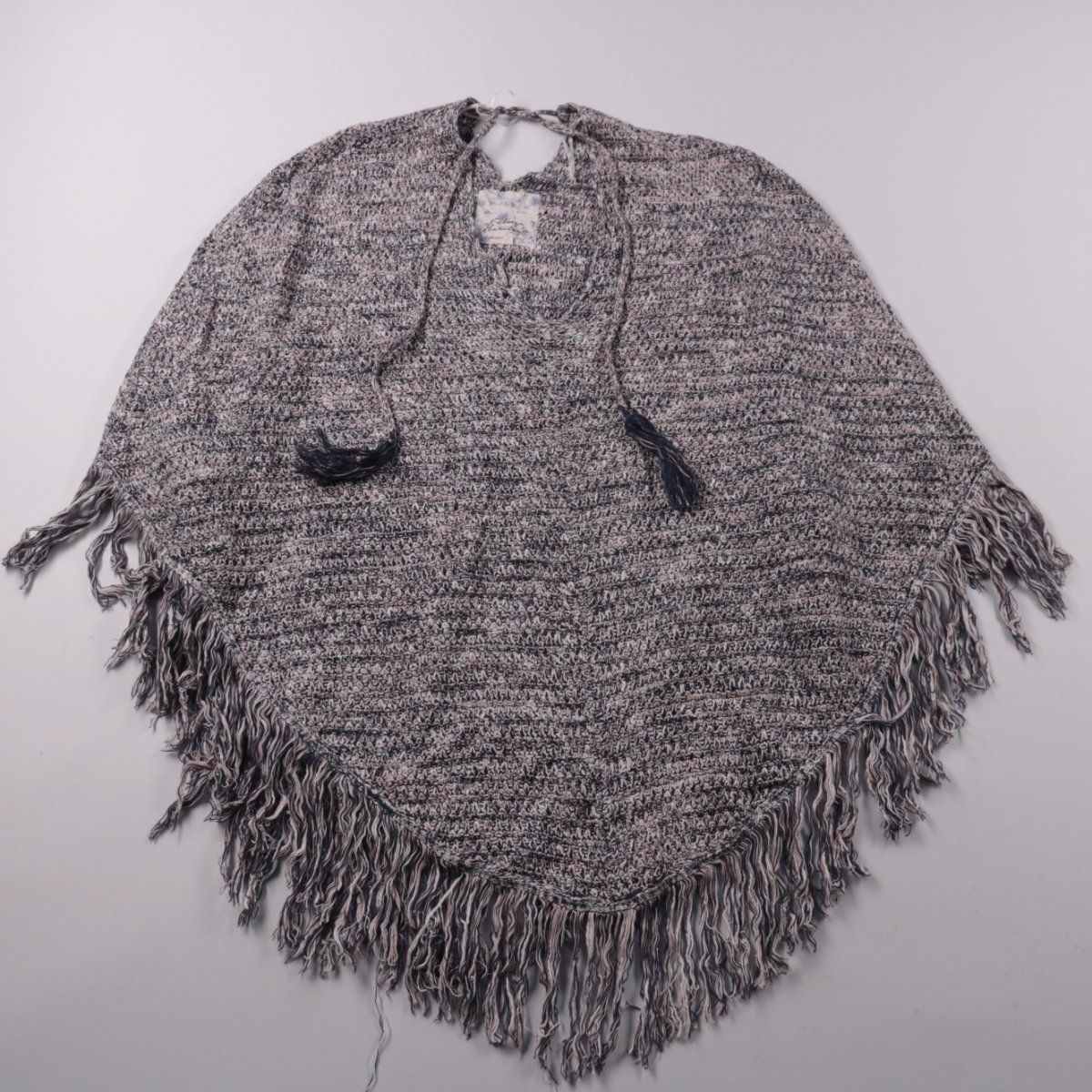 Вязаное пончо Fullmer Heritage меланжевого серого цвета с длинной бахромой по краю и завязками у горловины. Подойдёт для прохладной погоды на прогулки и в поездки, удобно накидывается поверх водолазки или свитера. Свободный крой не сковывает движения и подходит на разные типы фигуры.