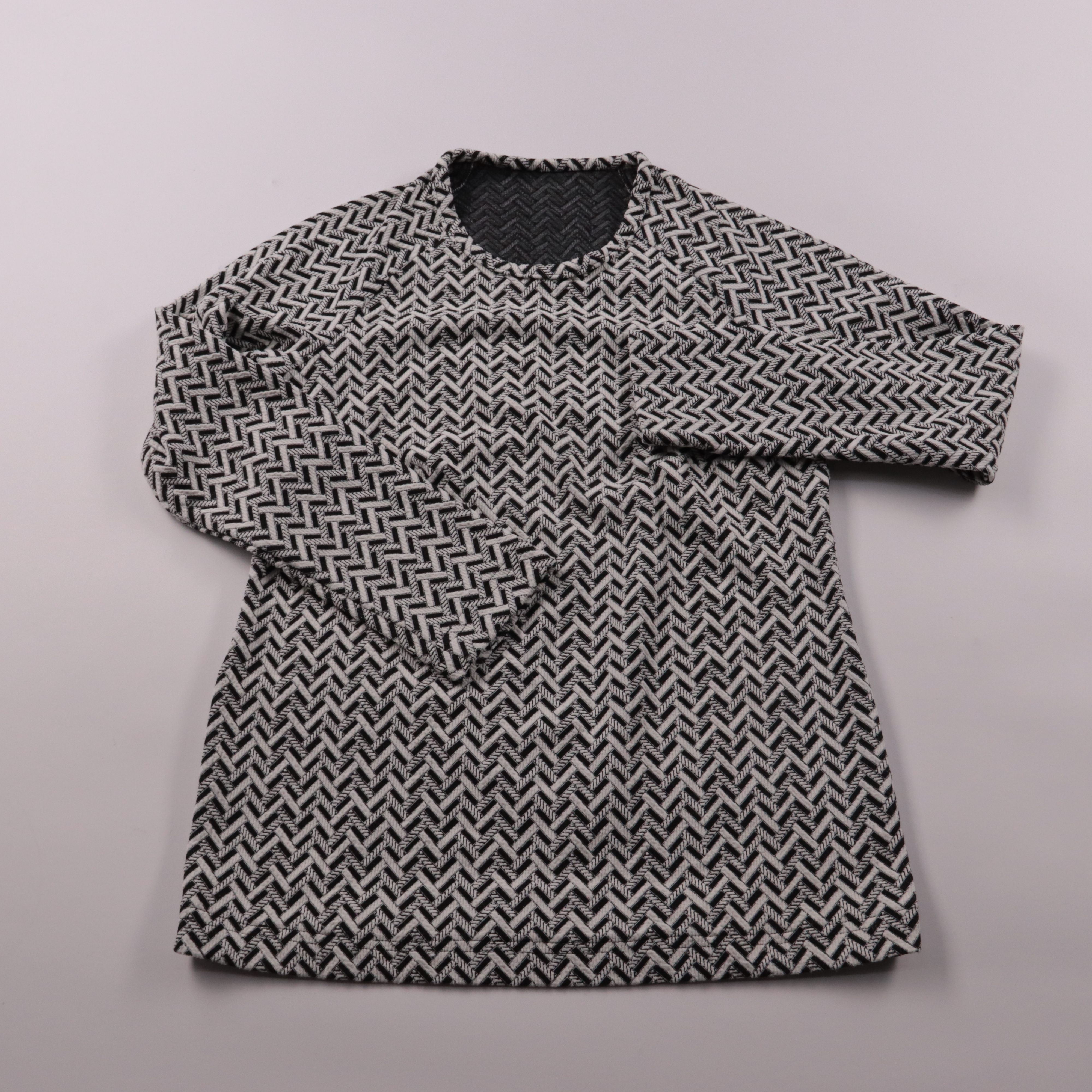 Детский джемпер без бренда с геометрическим черно-белым узором и круглым вырезом. Подойдет для школы и повседневной носки в прохладную погоду, удобно комбинируется с джинсами и брюками. Плотный трикотаж хорошо держит форму и согревает.
