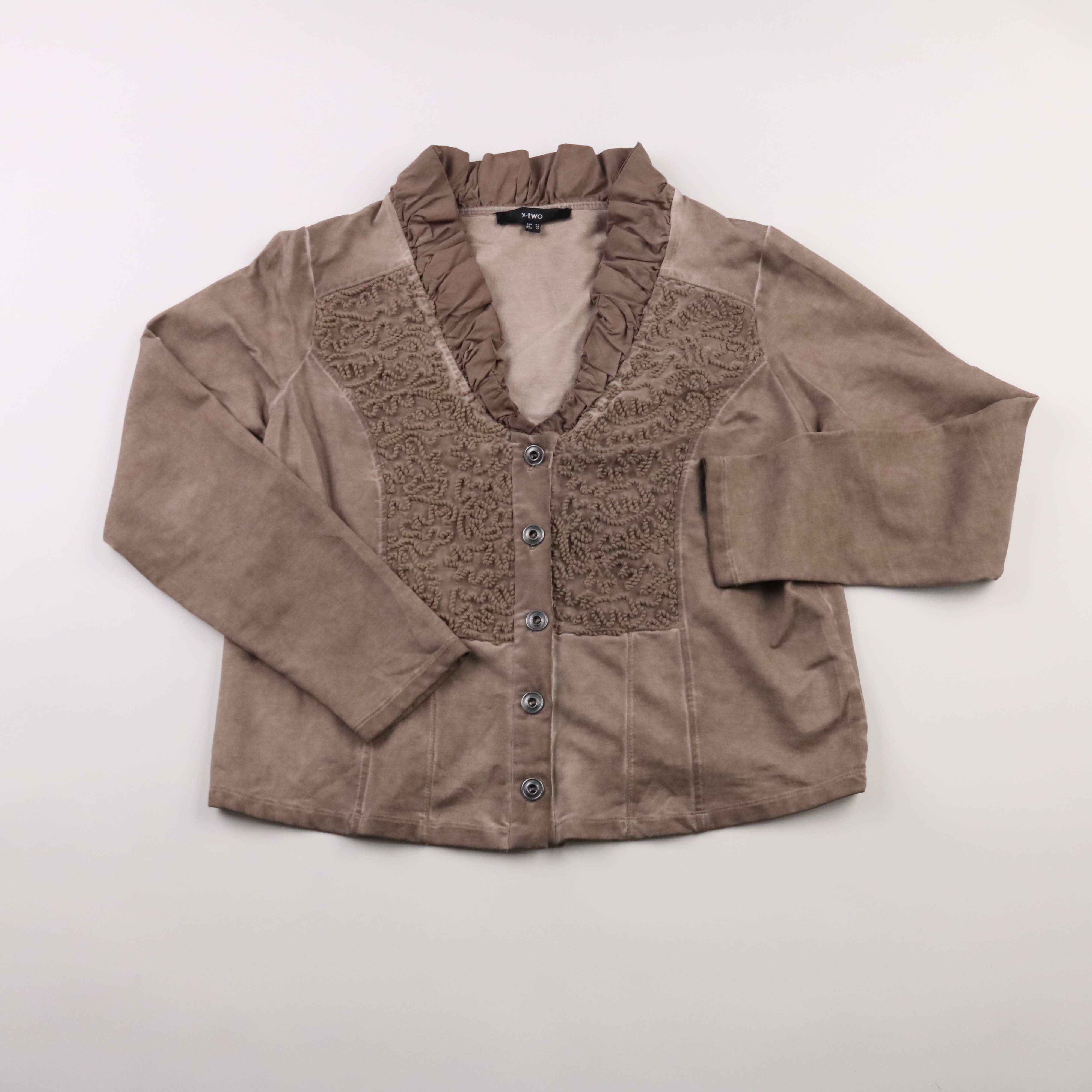 Кардиган X-two в бежево-коричневом оттенке с фактурной вышивкой на полочках и рюшами по вырезу, застёгивается на пуговицы. Подойдёт для повседневных образов в демисезон и прохладным летним вечером. Хлопковая ткань с добавлением эластана комфортно тянет...