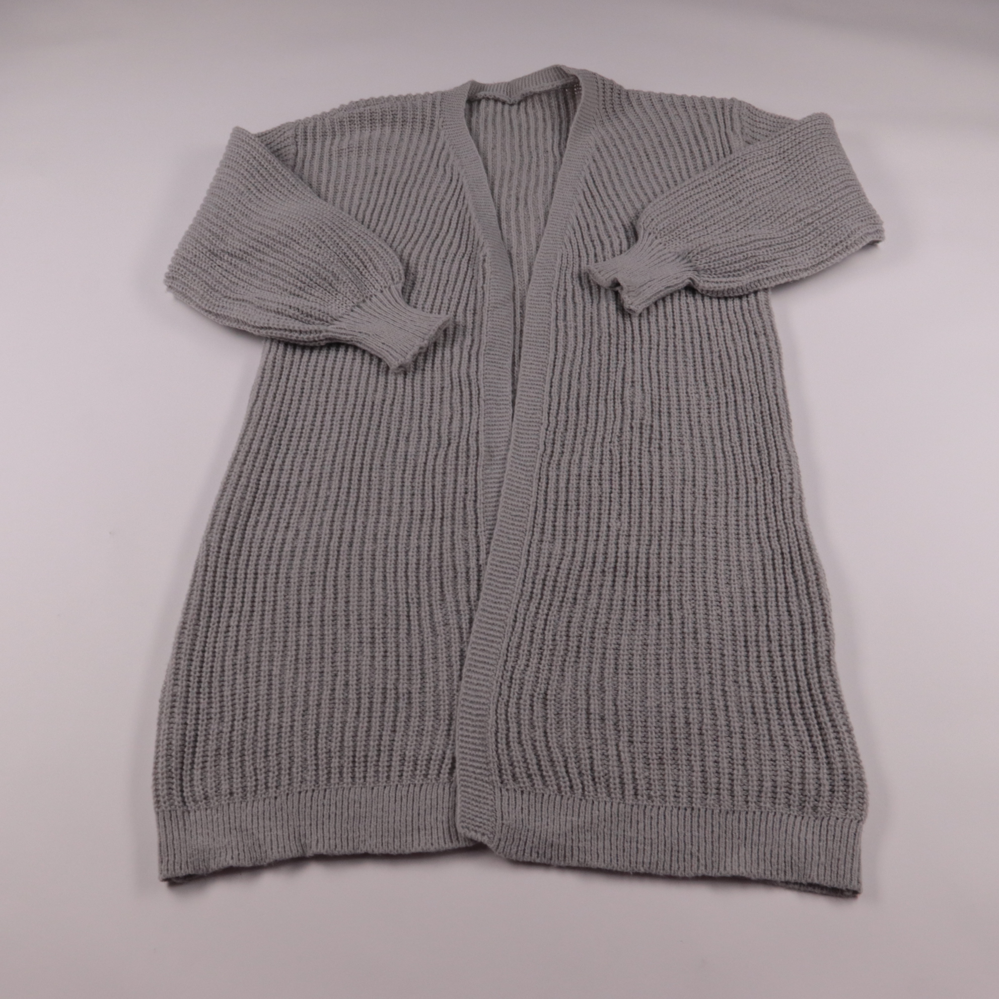 Вязаный кардиган Shein серого цвета с фактурной резинкой и открытым передом. Подойдёт для повседневных образов и офиса поверх топа или водолазки в прохладную погоду. Удобно накидывается и легко сочетается с джинсами и платьями.