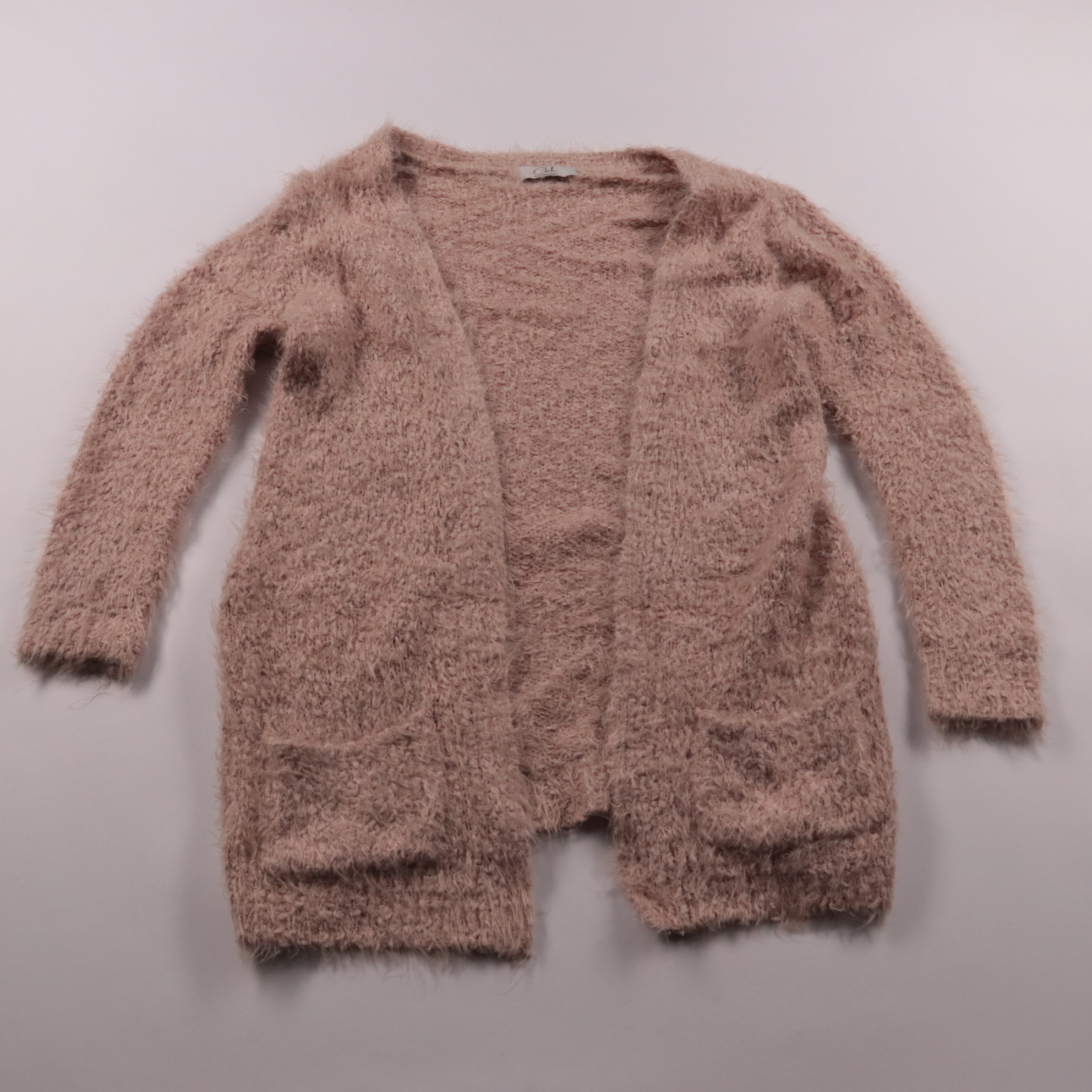 Вязаный кардиган Clockhouse с пушистой фактурой и открытым передом, в нежно-розовом оттенке. Подойдёт для повседневных образов и прохладных дней, хорошо смотрится поверх топа или платья. Практичный плюс — объёмные накладные карманы и мягкая посадка без...