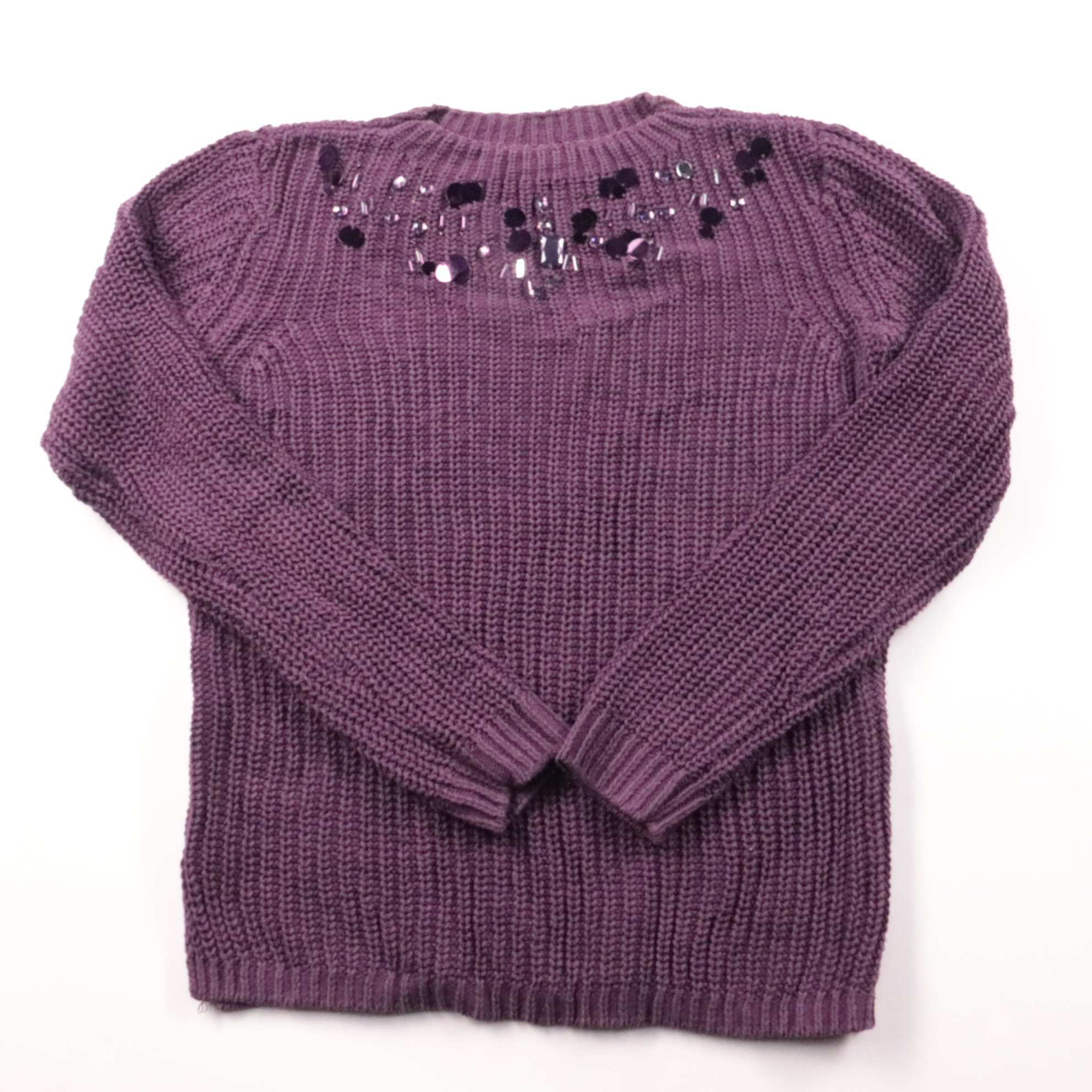 Вязаный свитер Yessica фиолетового цвета с круглым вырезом и декоративными пайетками/бисером по линии груди. Подойдёт для повседневных образов в прохладную погоду и хорошо сочетается с джинсами или юбкой. Плотная вязка помогает сохранять тепло и комфор...