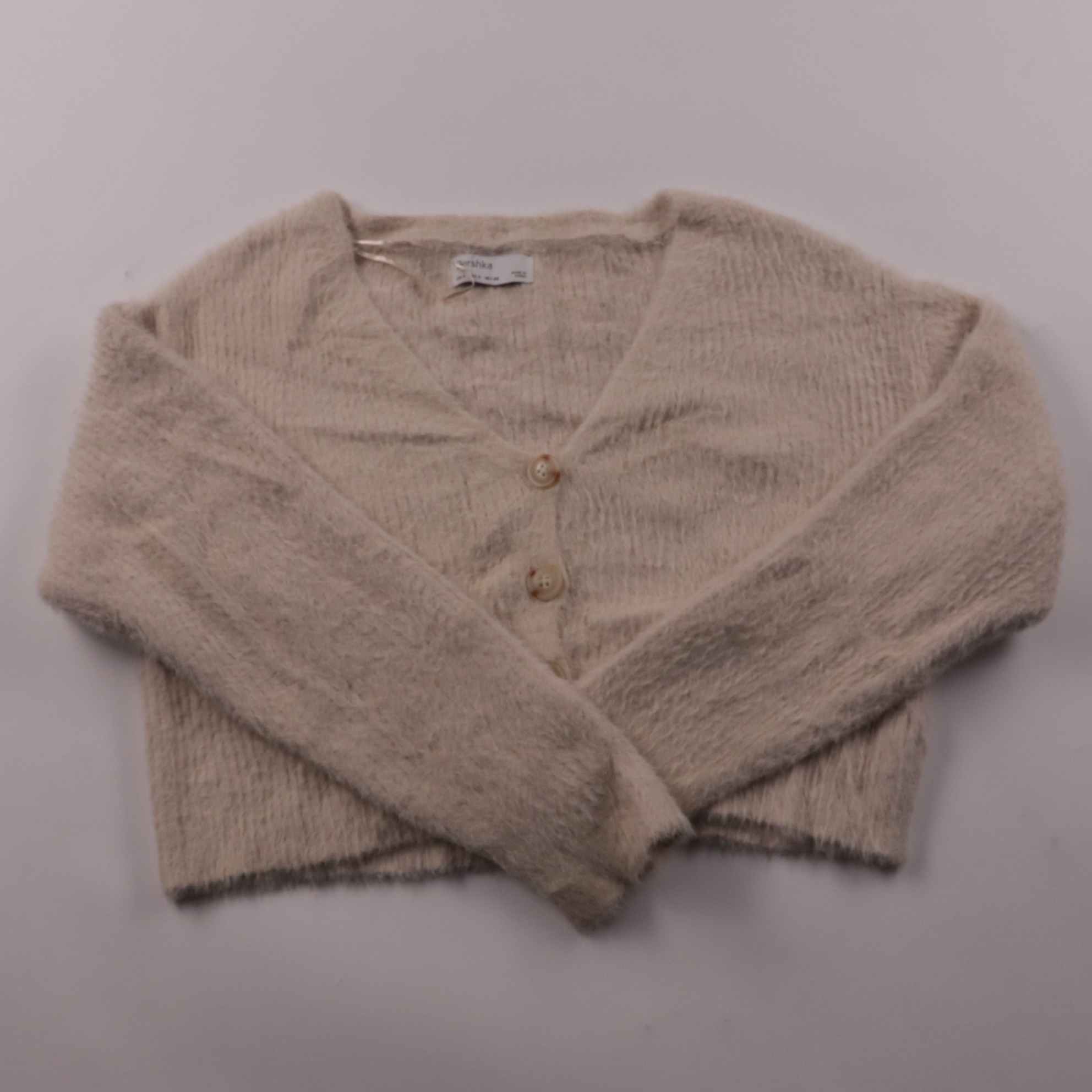 Укороченный кардиган Bershka из мягкого пушистого трикотажа с V-образным вырезом и застёжкой на пуговицы. Подойдёт для повседневных образов и в офис как второй слой поверх топа или платья. Лёгкий и компактный, удобно брать с собой на случай прохлады.