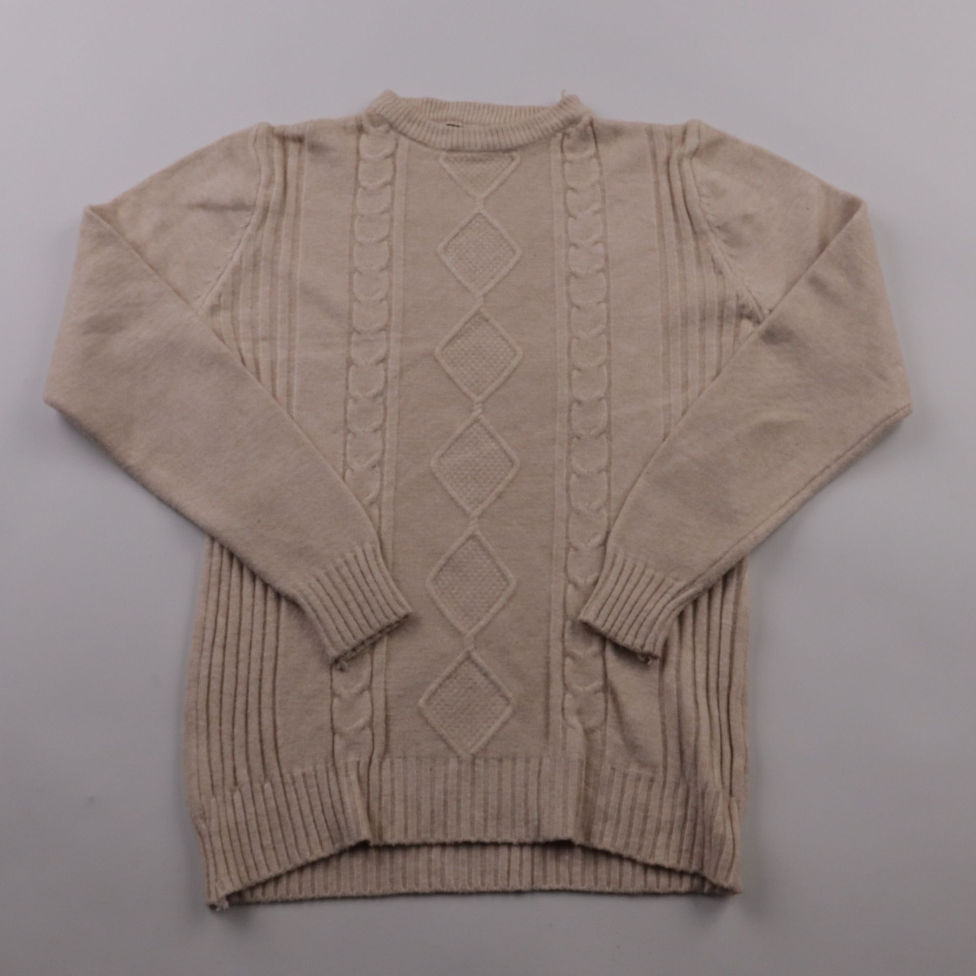 Женский свитер Buisdaei бежевого цвета с фактурной вязкой (косы и ромбы) и круглым воротом. Подойдёт для повседневных образов в прохладную погоду, хорошо сочетается с джинсами и юбками. Мягкий трикотаж и эластичные манжеты делают посадку комфортной.