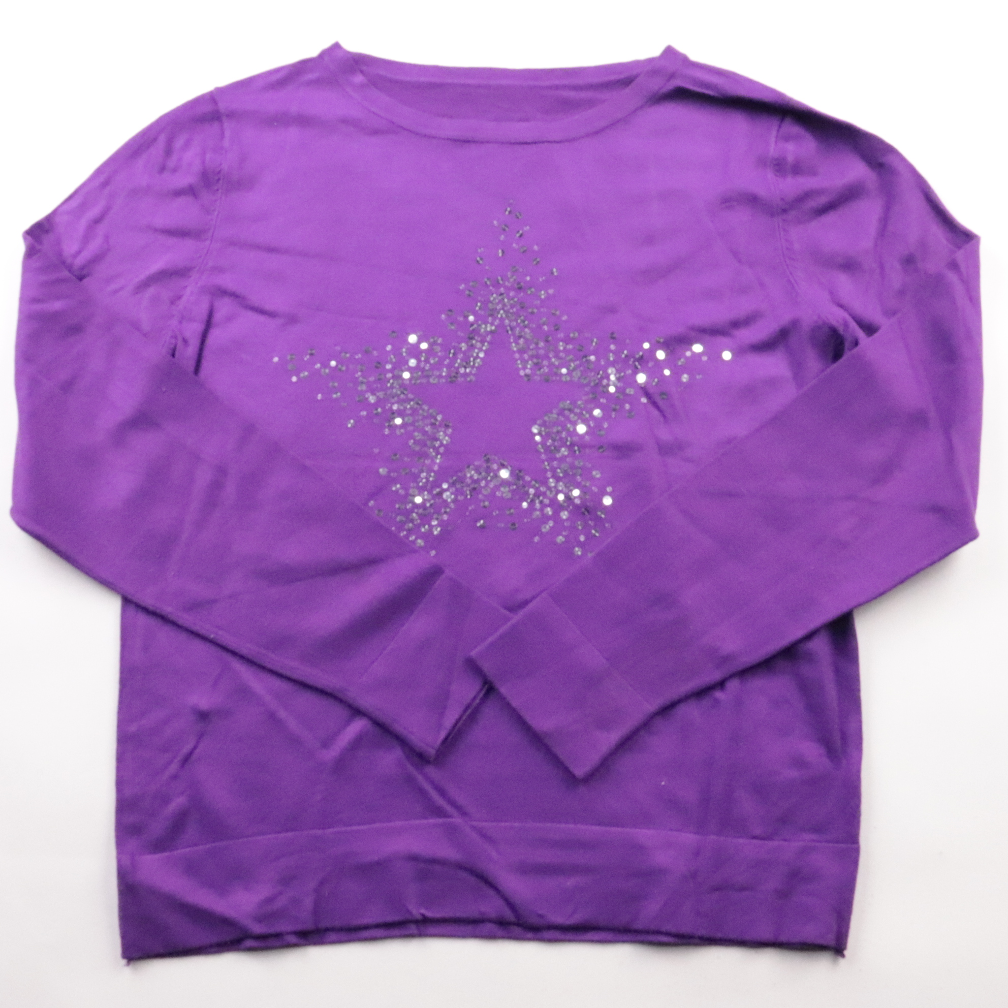 Женский джемпер Wallis фиолетового цвета с принтом-звездой из пайеток на груди. Подойдёт для повседневных образов и на выход, хорошо сочетается с джинсами и юбками. Мягкий трикотаж приятен к телу и комфортно носится в помещении.