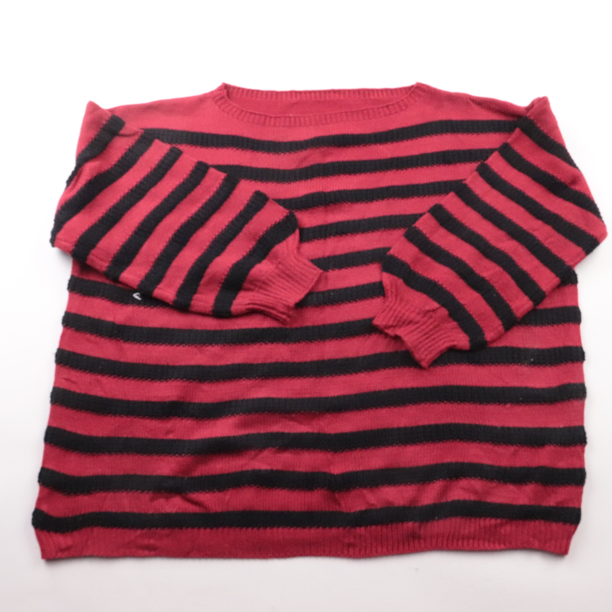 Женский свитер Shein Curve в красно-чёрную полоску, мягкая вязка с круглым вырезом и манжетами. Подойдёт для повседневных образов в прохладную погоду — с джинсами или брюками. Акриловый состав прост в уходе и быстро сохнет.