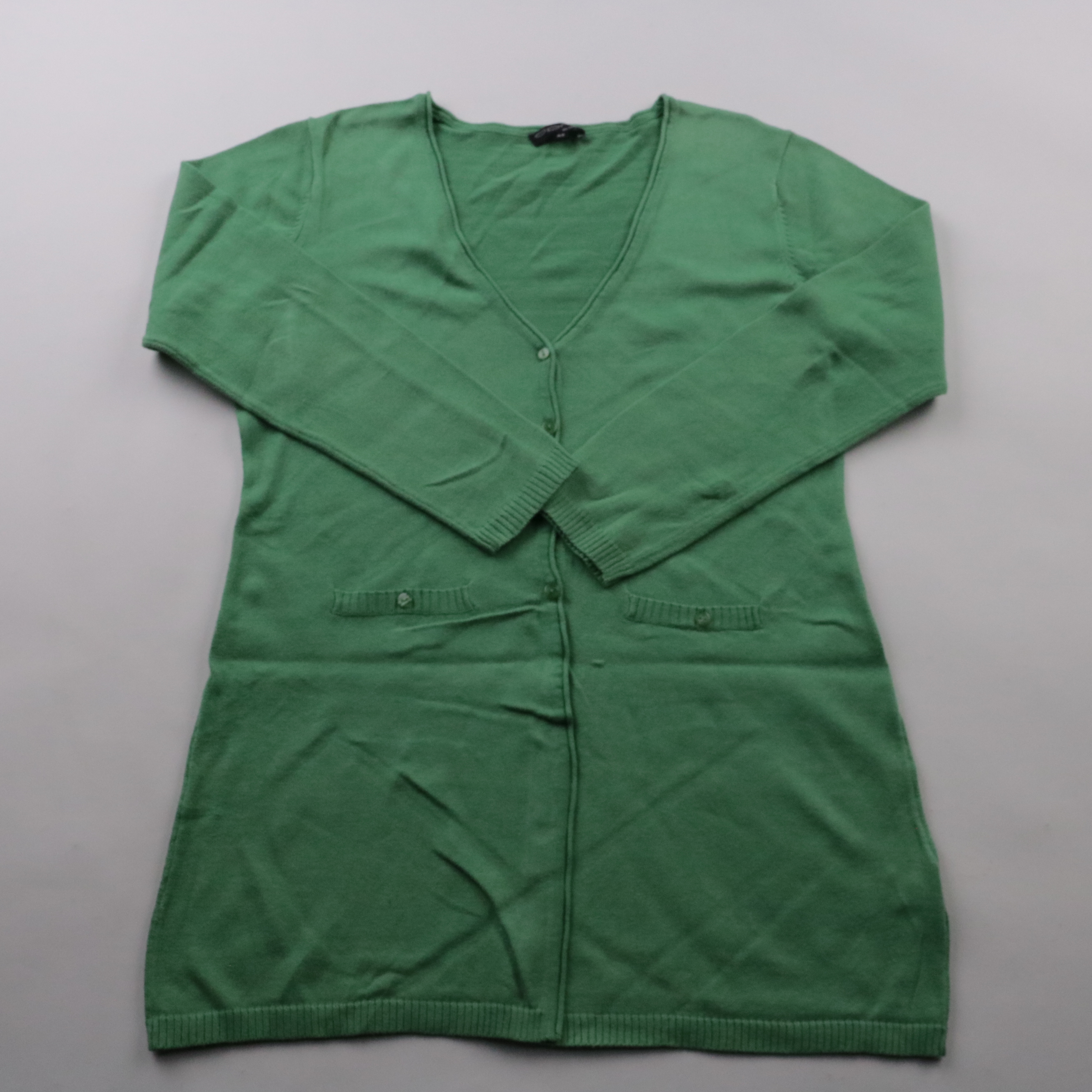 Зелёный кардиган APAN на пуговицах с V‑вырезом и длинным рукавом. Подойдёт для офиса и повседневных образов в прохладную погоду, удобно носить как второй слой. Хлопковая пряжа с добавлением акрила практична в уходе и хорошо держит форму.