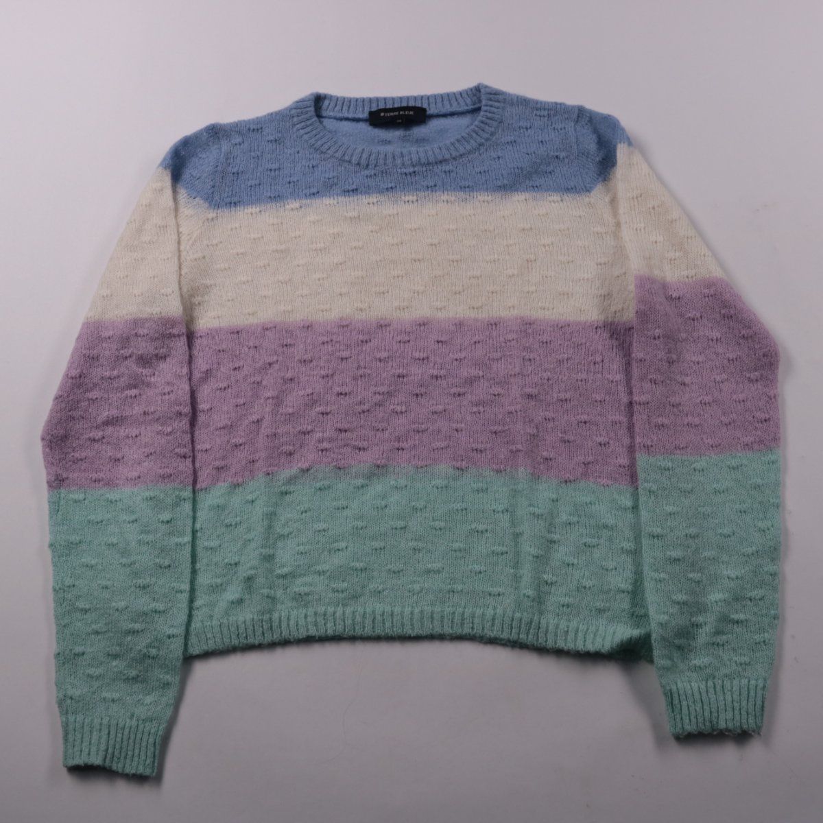 Вязаный джемпер Terre Bleue в пастельную полоску (голубой, молочный, сиреневый, мятный) с круглым вырезом и фактурной вязкой. Подойдёт для повседневных образов в межсезонье и прохладным летом, хорошо сочетается с джинсами и юбками. За счёт мохера в составе мягкий и тёплый, при этом лёгкий.
