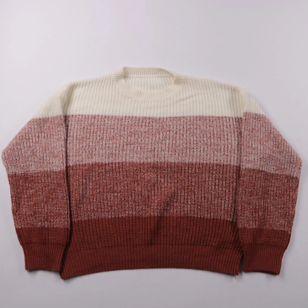 Вязаный свитер в горизонтальную полоску без указанного бренда, с круглым вырезом и манжетами. Подойдёт для повседневной носки в прохладную погоду, легко сочетается с джинсами и брюками. Практичен тем, что материал 100% полиэстер — менее капризен в уходе и быстро сохнет.