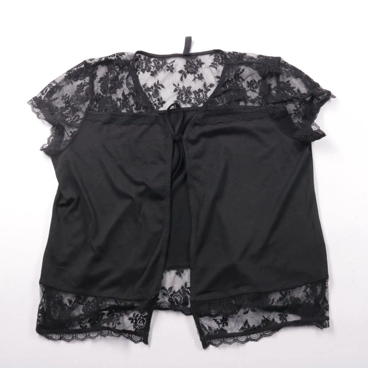Лёгкий женский кардиган Flame в чёрном цвете с кружевными вставками и коротким рукавом, на завязке спереди. Подойдёт как накидка поверх топа или платья для вечерних выходов и нарядных образов. Плюс — тонкий материал почти не занимает места и удобно брать с собой.