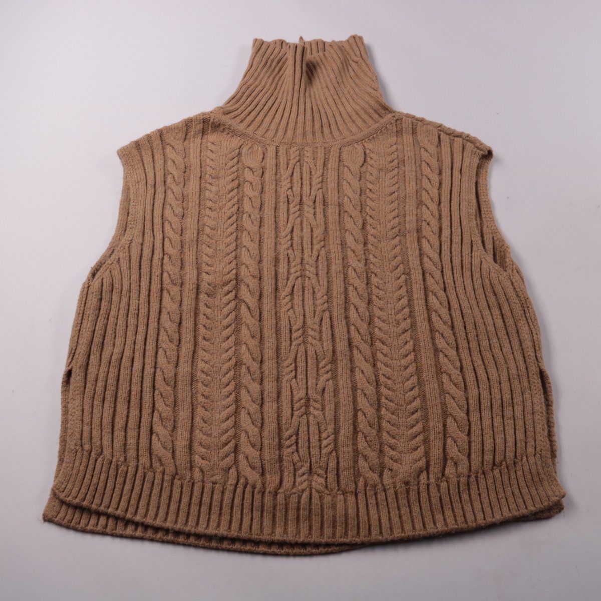 Вязаный жилет-свитер M&S с высоким воротом и рельефным узором «косы», цвет Camel Mix. Подойдёт для зимы и демисезона поверх рубашки или водолазки на каждый день. Смесовая пряжа проста в уходе и хорошо держит форму.
