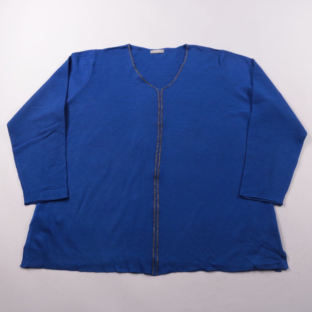 Женский кардиган Rabe синего цвета с V-образным вырезом и декоративной отделкой по планке. Подойдёт для офиса и повседневных образов в прохладную погоду. Трикотажный материал приятный к телу и удобно носить слоями.