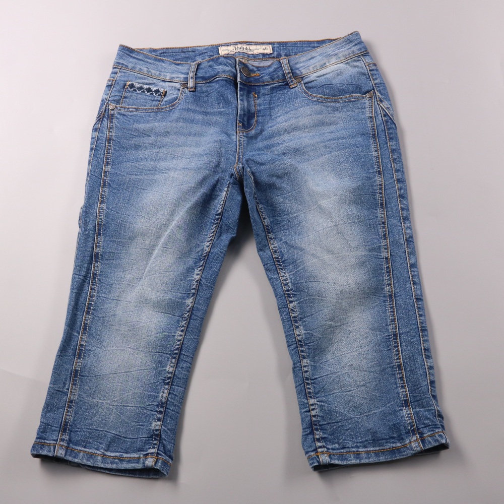 Женские джинсы Multiblu укороченной длины, выполнены из синего денима с лёгкими потёртостями и декоративной отделкой карманов. Подойдут для повседневных образов на каждый день в любое время года. Материал с добавлением эластана комфортнее садится по фи...