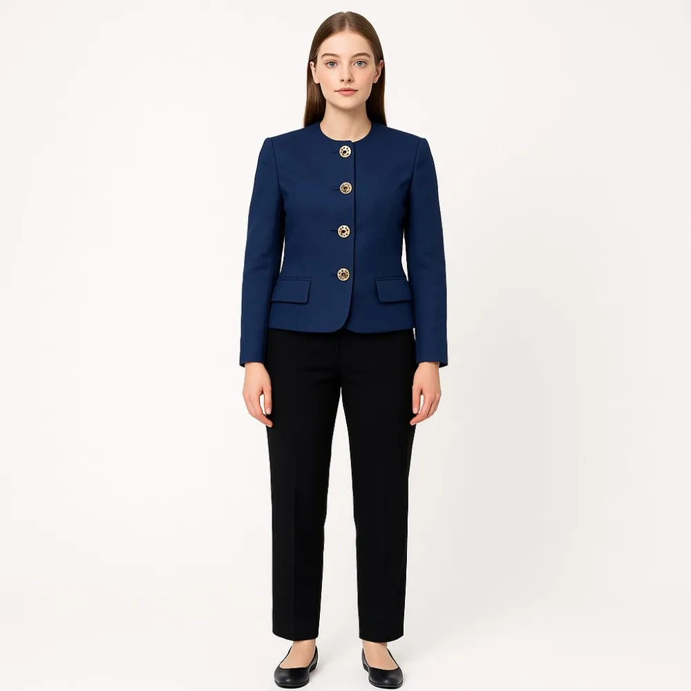 Женский пиджак прямого кроя на пуговицах, базовая модель для офиса и деловых встреч. Глубокий синий цвет легко сочетается с брюками, юбками и джинсами, а лаконичный круглый вырез делает образ аккуратным. Практичные карманы с клапанами и плотная ткань х...
