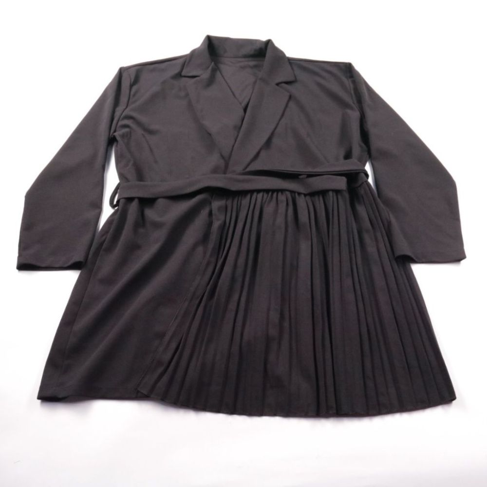 Женский чёрный пиджак с поясом и плиссированной вставкой, создающей акцент на талии. Подойдёт для офиса и выходов, легко сочетается с брюками и юбками. Ткань с эластаном чуть тянется и комфортно садится по фигуре.