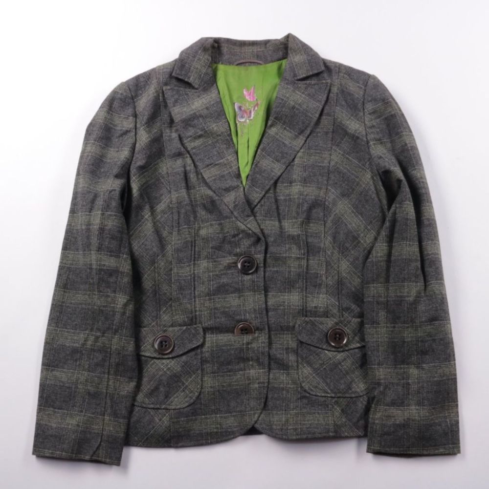 Женский пиджак в клетку с яркой зелёной подкладкой, приталенного силуэта и с накладными карманами на пуговицах. Подойдёт для офиса и повседневных образов в демисезон, хорошо сочетается с джинсами и классическими брюками. Практичен тем, что ткань со стр...