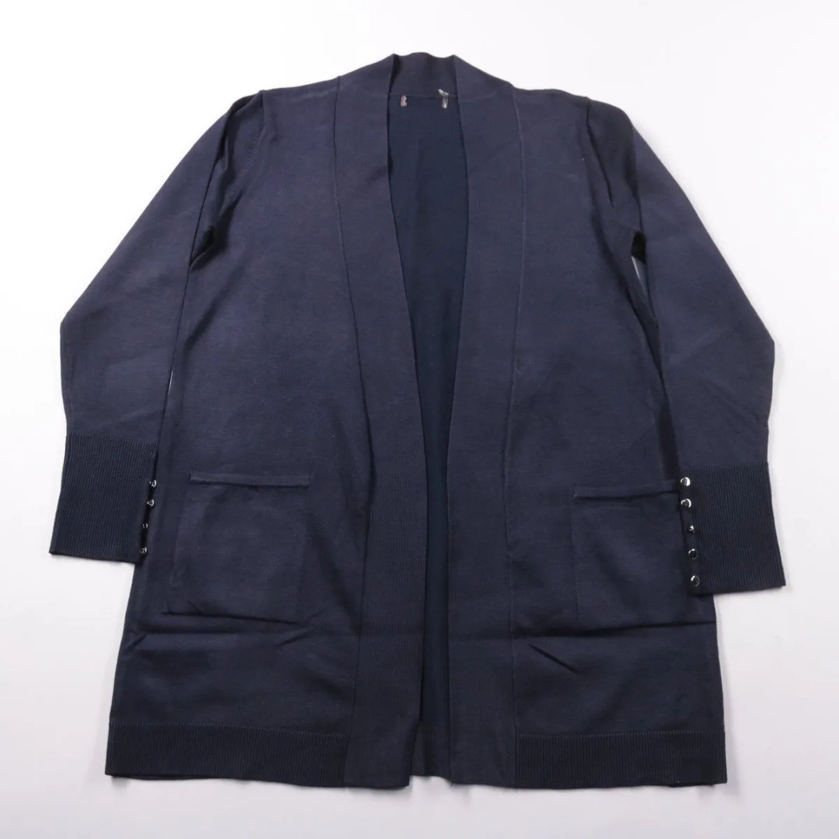 Женский пиджак без бренда в тёмно-синем цвете, без застёжки, с накладными карманами и декоративными манжетами на пуговицах. Подойдёт для офиса и повседневных образов, хорошо смотрится с брюками, юбкой или джинсами. Практичен тем, что легко сочетается с базовыми вещами и не стесняет движений.