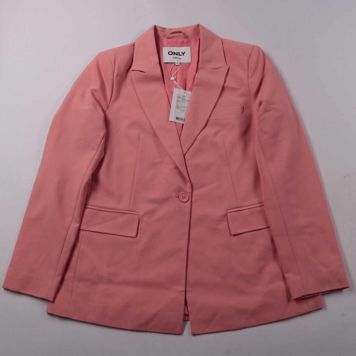 Женский пиджак ONLY в оттенке Coral Haze (розово-коралловый), однобортный, на пуговице, с лацканами и карманами с клапанами. Подойдёт для офиса и повседневных образов с джинсами или брюками. Ткань с эластаном даёт небольшую эластичность и комфорт в носке.