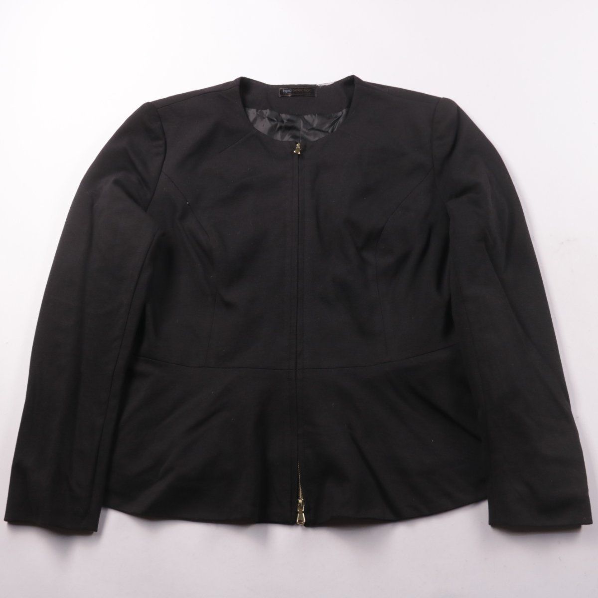 Женский пиджак bpc selection чёрного цвета, приталенный, на молнии и без лацканов. Подойдёт для офиса и повседневных образов в прохладную погоду. Практичен тем, что легко сочетается с брюками и юбками благодаря базовому цвету.