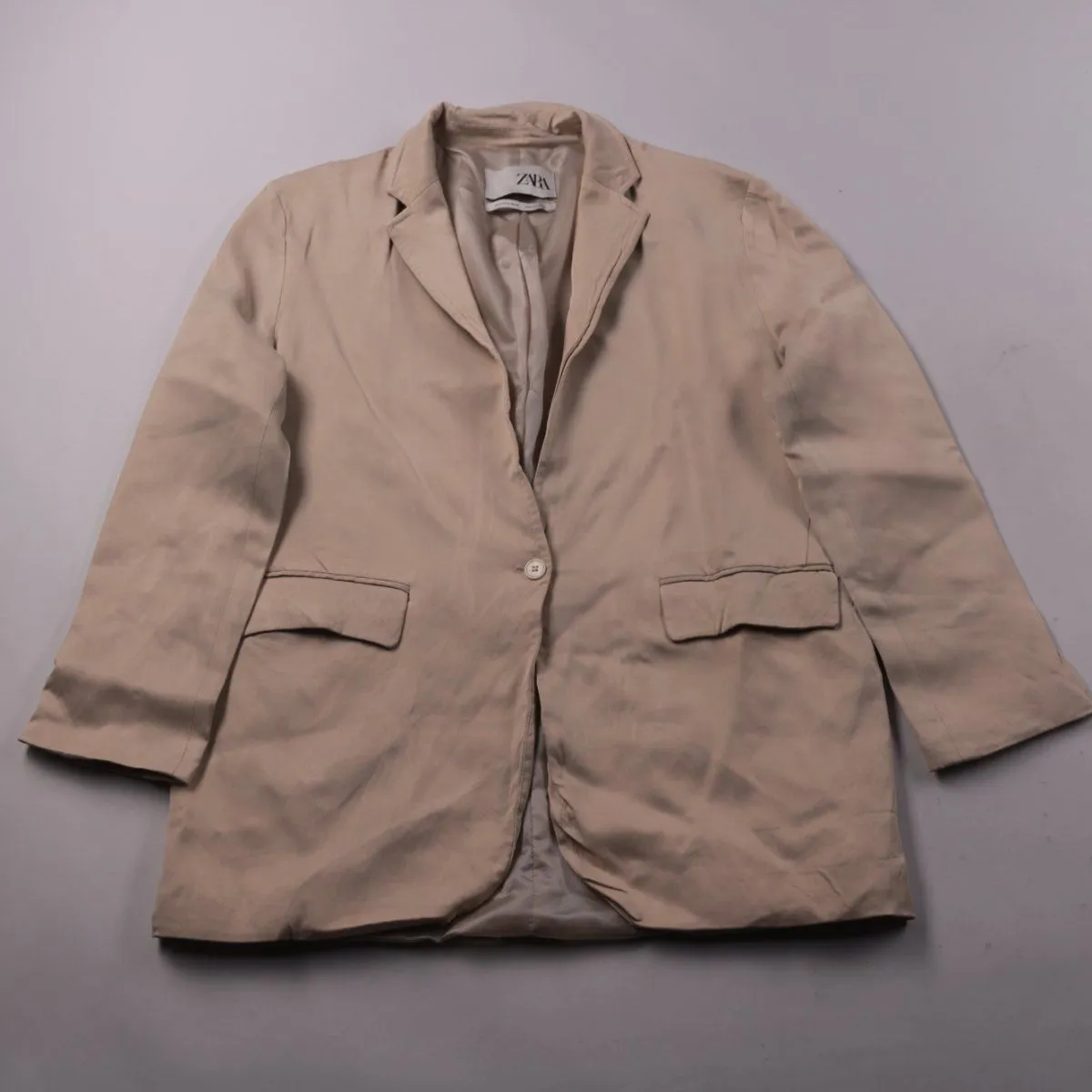 Женский пиджак Zara бежевого цвета, однобортный на одну пуговицу, с лацканами и карманами с клапанами. Подойдёт для офиса и повседневных образов в демисезон и прохладное лето. Ткань с эластаном даёт немного эластичности и комфорт в носке.