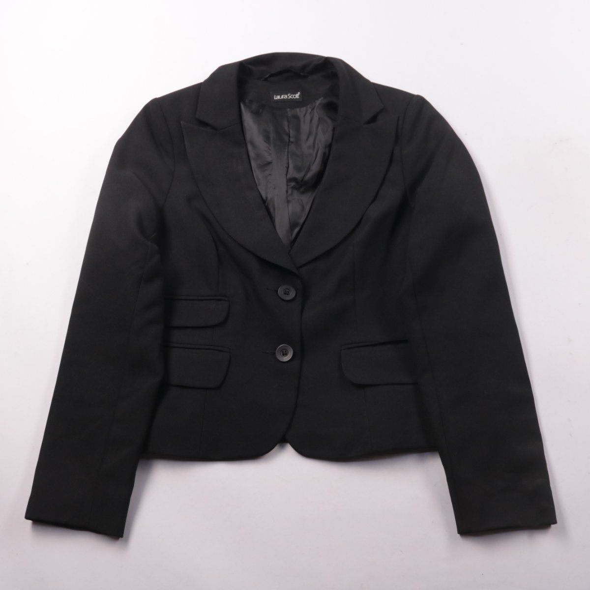Классический женский пиджак Laura Scott чёрного цвета, приталенный крой на две пуговицы и с карманами-клапанами. Подойдёт для офиса, деловых встреч и вечерних выходов с брюками или юбкой. Полностью на подкладке, поэтому держит форму и комфортно надевается поверх блузки.