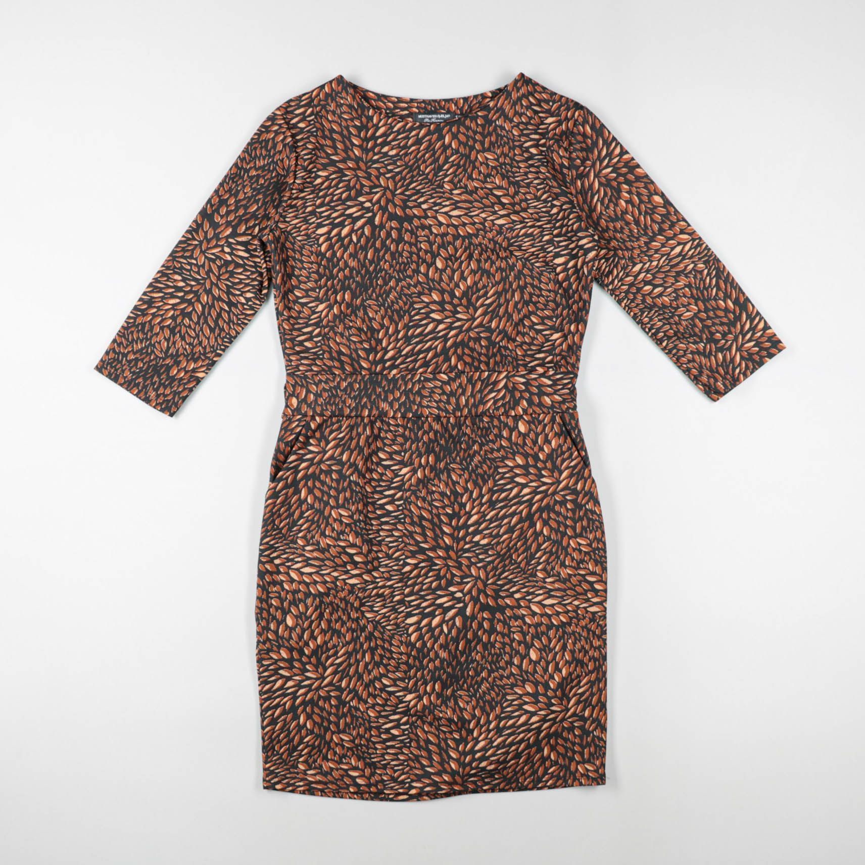 Повседневное платье United Colors of Benetton с рукавом 3/4 и поясом на талии, принт в рыже‑чёрных тонах. Подойдёт для офиса, встреч и прогулок в демисезон и прохладное лето. Пояс помогает регулировать посадку и подчёркивает силуэт.