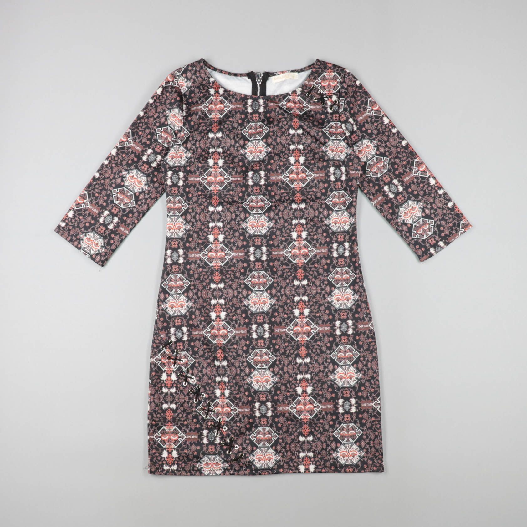 Повседневное платье с длинным рукавом и геометрическим принтом, бренд на бирке не читается. Подойдёт для офиса или на каждый день, хорошо сочетается с ботильонами и однотонным жакетом. Сзади удобная молния по всей длине, что облегчает надевание.