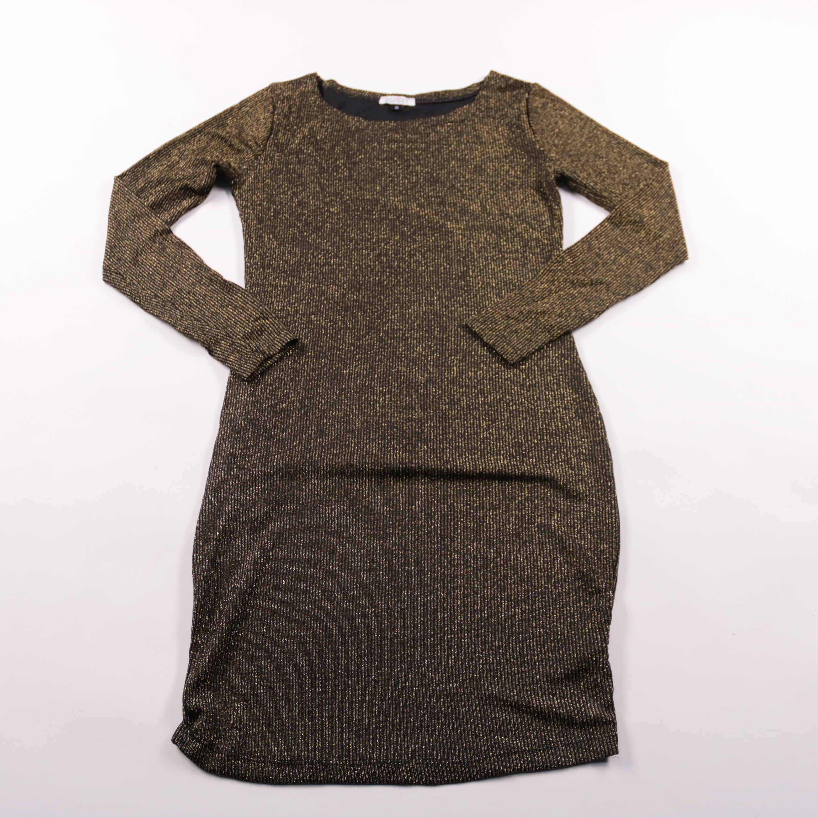 Повседневное платье The Spirit из трикотажа в рубчик с деликатным золотистым люрексом и длинным рукавом. Подойдёт для офиса и вечерних выходов, хорошо смотрится с ботильонами или туфлями. Эластичная ткань комфортно садится по фигуре и почти не мнётся.