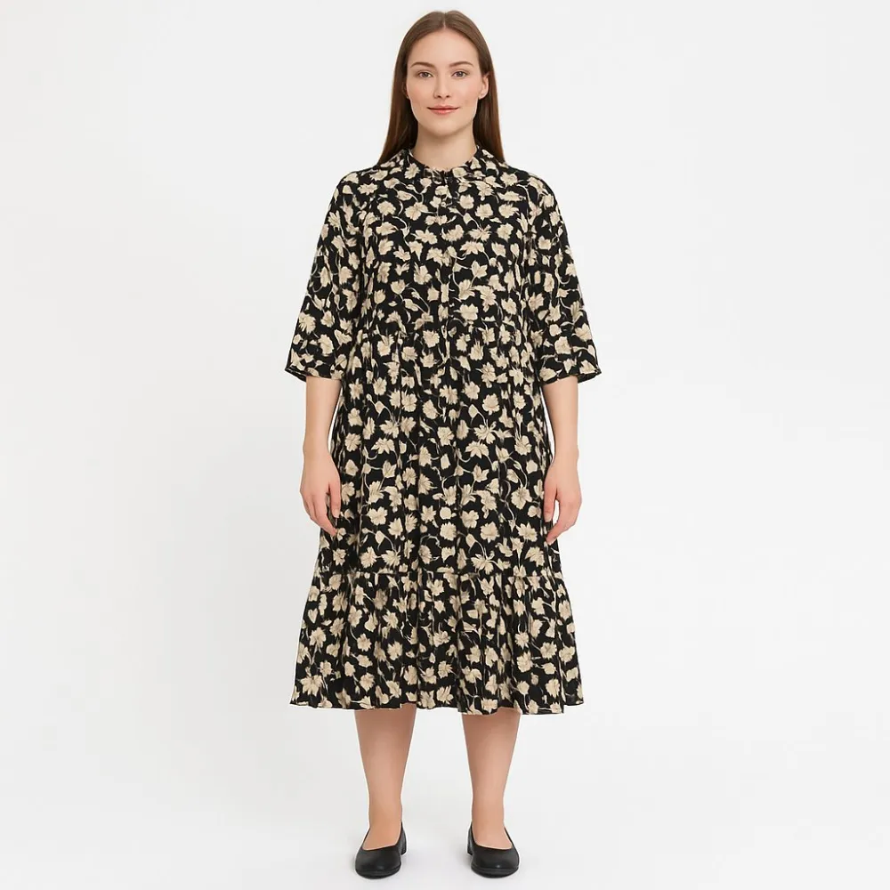 Повседневное платье George миди длины с чёрно-бежевым цветочным принтом и свободным силуэтом. Подойдёт для работы и прогулок, легко сочетается с лоферами или кедами. Практичный материал почти не мнётся и прост в уходе.