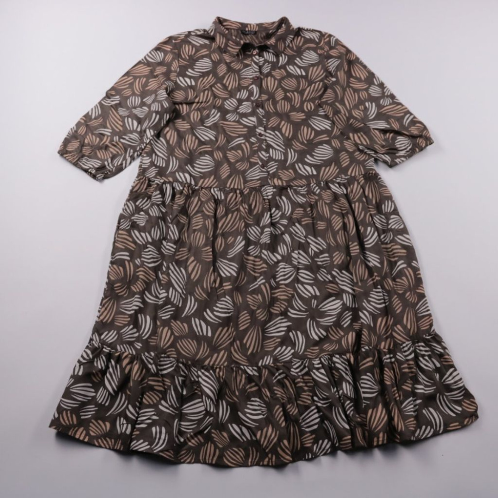 Повседневное платье Re.draft из лёгкой ткани с принтом в бежево-белых оттенках и отложным воротником на пуговицах. Подойдёт для офиса, прогулок и повседневных образов; свободный крой с ярусной юбкой не сковывает движения. Практичный плюс — немаркий цве...