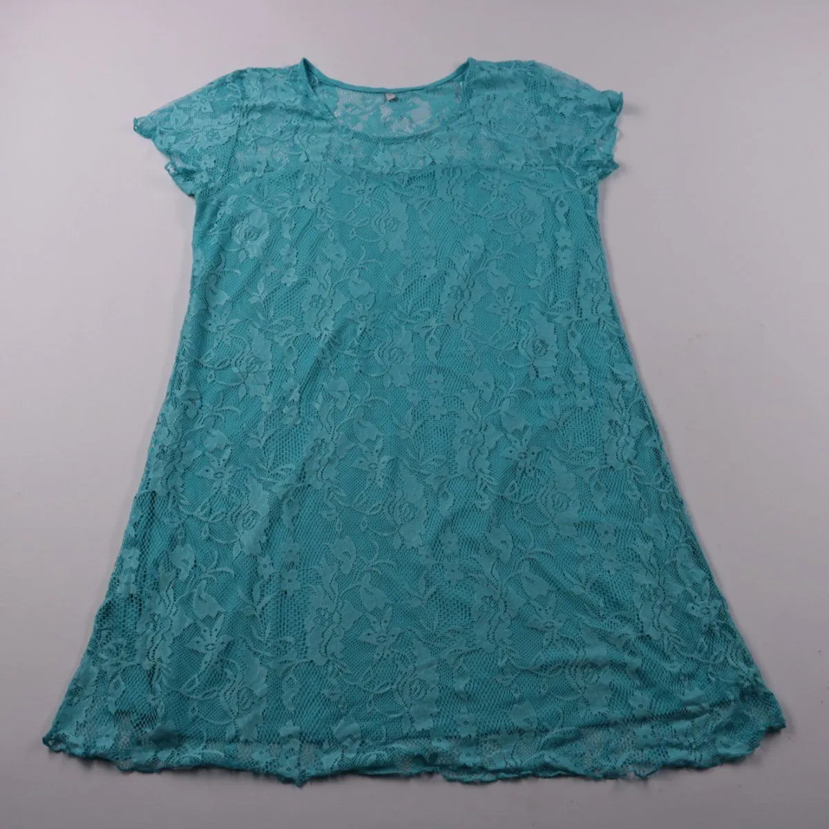 Женское кружевное платье без указания бренда, выполнено из полиэстера с подкладкой. Подойдёт для летних прогулок и повседневных выходов благодаря свободному крою и коротким рукавам. Лёгкая сетчатая фактура хорошо пропускает воздух и быстро сохнет.