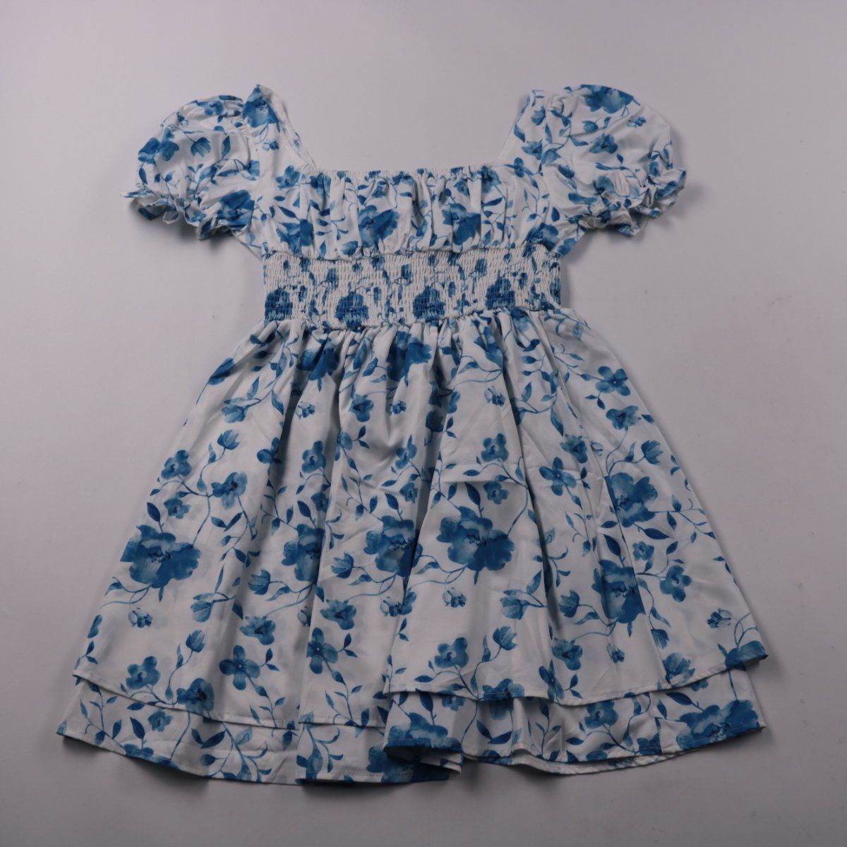 Женское повседневное платье SHEIN с бело-синим цветочным принтом, пышными рукавами и эластичной сборкой (смокинг) на лифе. Подойдёт для летних прогулок и отдыха, хорошо держится по фигуре за счёт тянущейся талии. Лёгкая синтетическая ткань быстро сохнет и почти не мнётся.