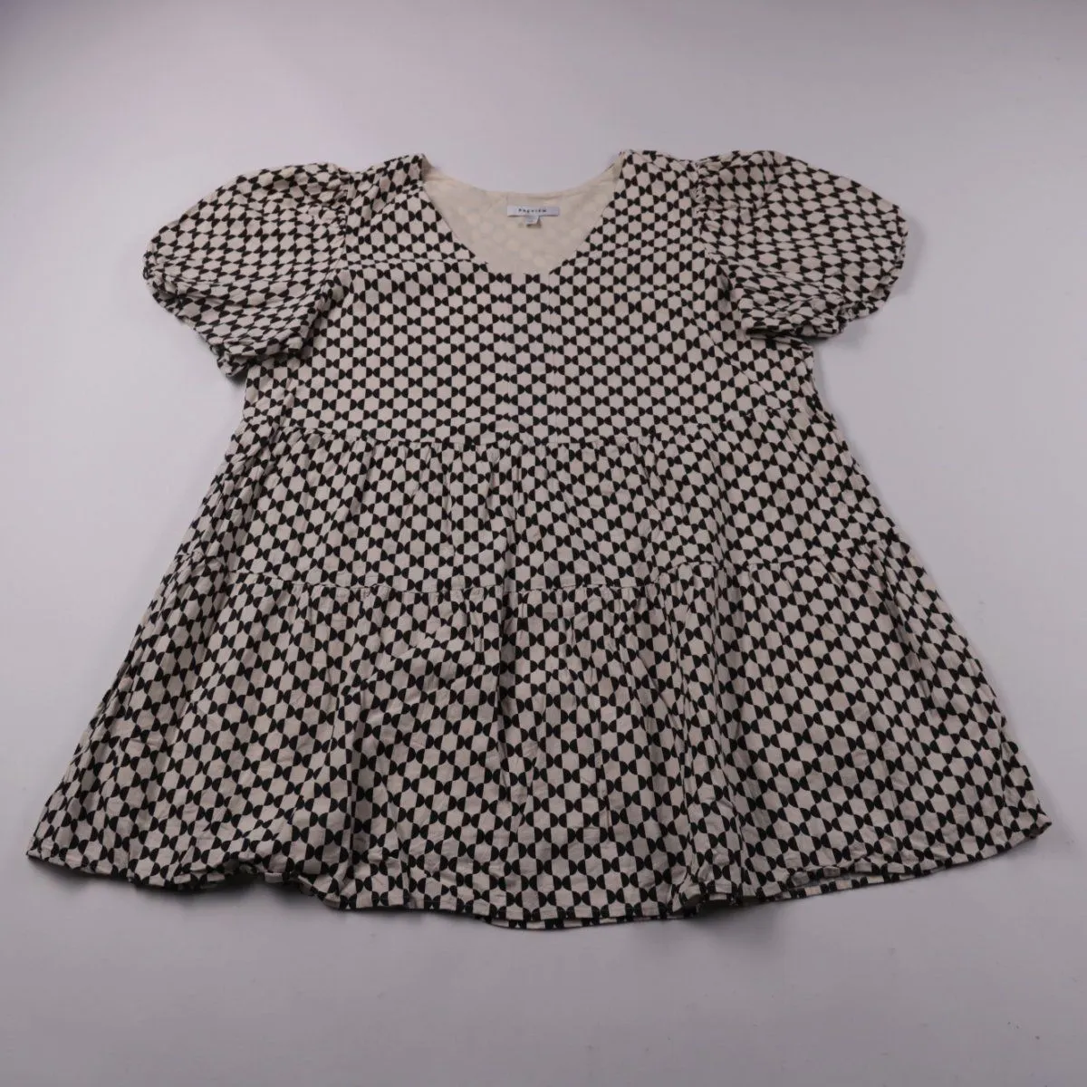 Повседневное платье Preview с геометрическим чёрно-белым принтом, пышными рукавами и ярусной юбкой. Подойдёт для тёплой погоды и прогулок, легко сочетается с босоножками или кедами. Есть хлопковая подкладка, поэтому комфортнее к телу и меньше просвечивает.