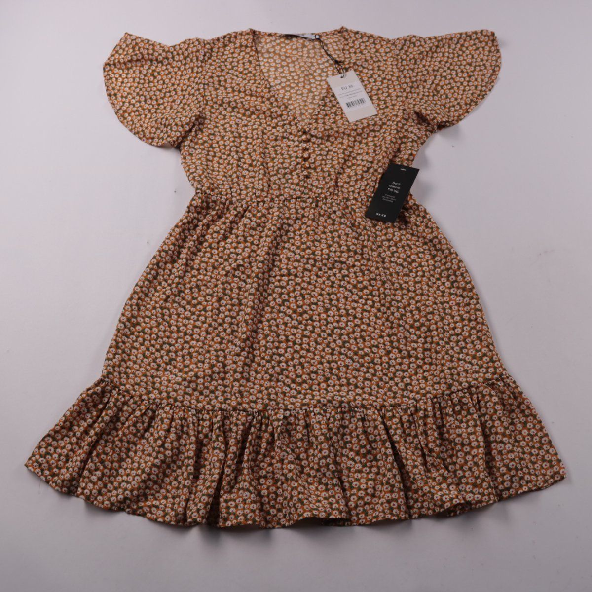 Повседневное платье NA-KD с мелким цветочным принтом, короткими рукавами и оборкой по низу. Подойдёт для летних прогулок и на каждый день. Лёгкий полиэстер быстро сохнет и проще в уходе.
