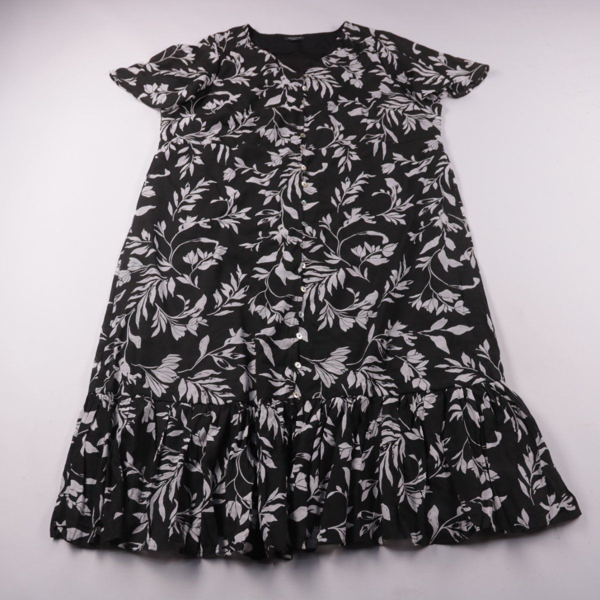 Повседневное платье Autograph с коротким рукавом, V-вырезом и застёжкой на пуговицы, чёрное с белым растительным принтом и воланом по низу. Подойдёт для лета и отдыха, ткань на основе вискозы хорошо пропускает воздух. Удобно тем, что легко сочетается с кедами или сандалиями.