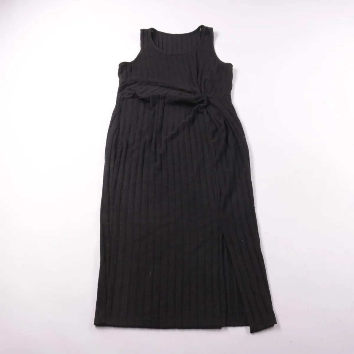Повседневное чёрное платье SHEIN Curve без рукавов, фактура в рубчик с драпировкой/узлом спереди и разрезом снизу. Подойдёт для летних прогулок и повседневных образов, можно носить соло или с жакетом. Эластичный материал хорошо тянется и комфортно садится по фигуре.