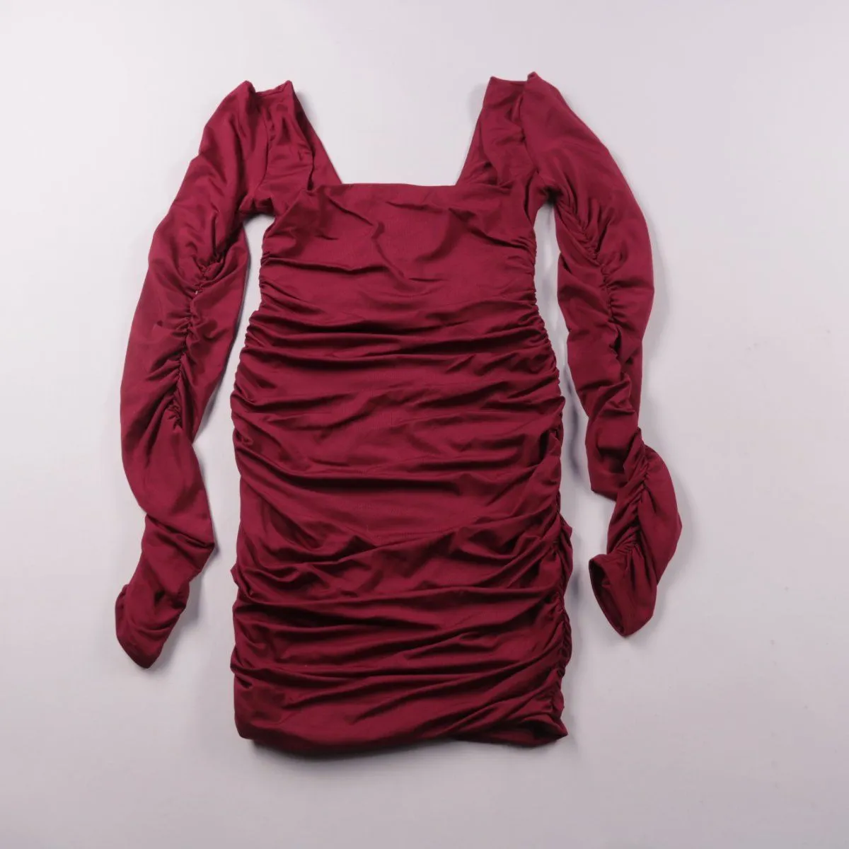 Облегающее платье Oh Polly бордового цвета с драпировкой по корпусу и рукавам и квадратным вырезом. Подойдёт для вечерних выходов и мероприятий, когда нужен акцентный силуэт. Эластичная ткань хорошо тянется и комфортно садится по фигуре.