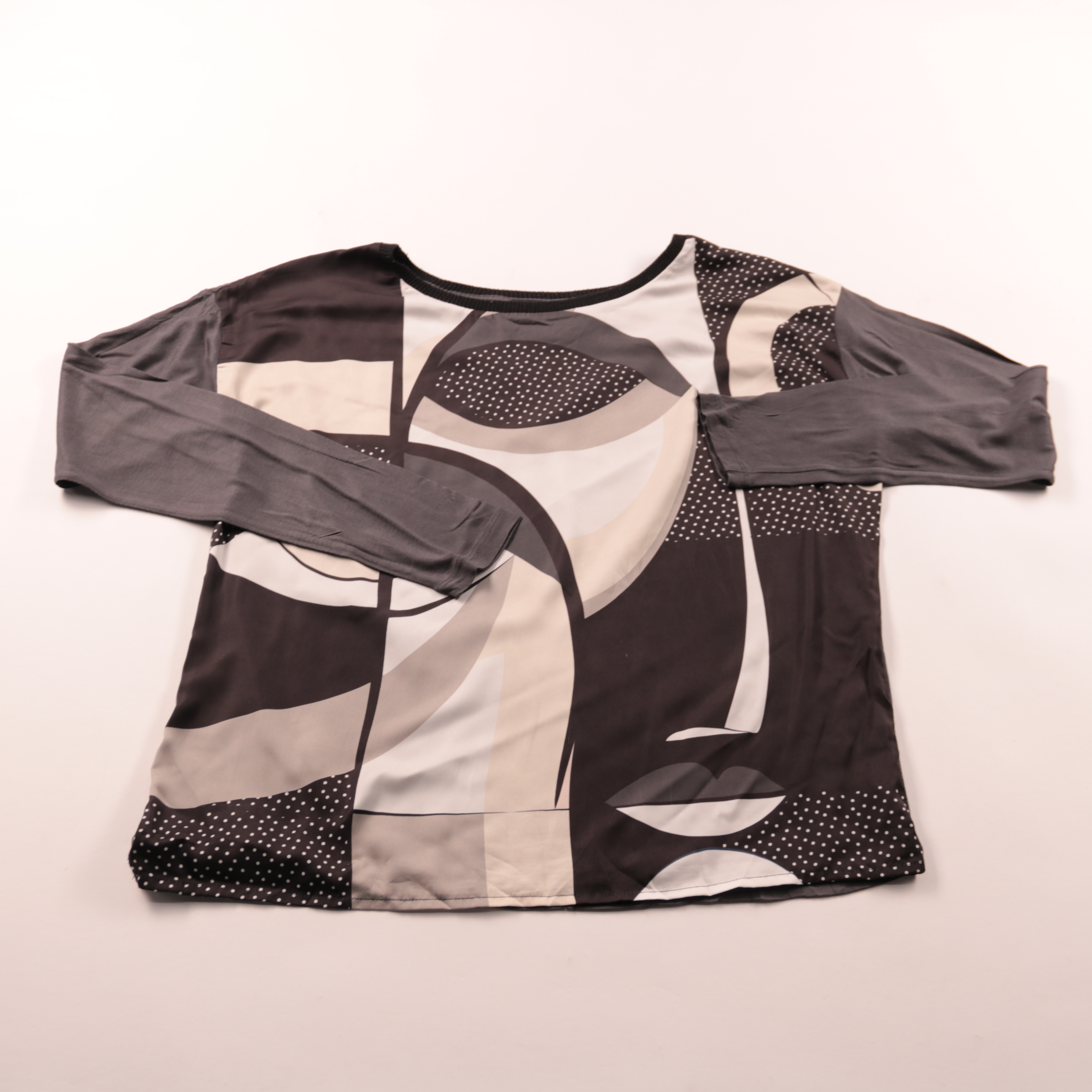 Блузка Expresso с длинным рукавом и абстрактным чёрно-бело-серым принтом. Подойдёт для офиса и повседневных образов, хорошо смотрится с однотонными брюками или юбкой. Лёгкая ткань приятна к телу и почти не занимает места в сумке.