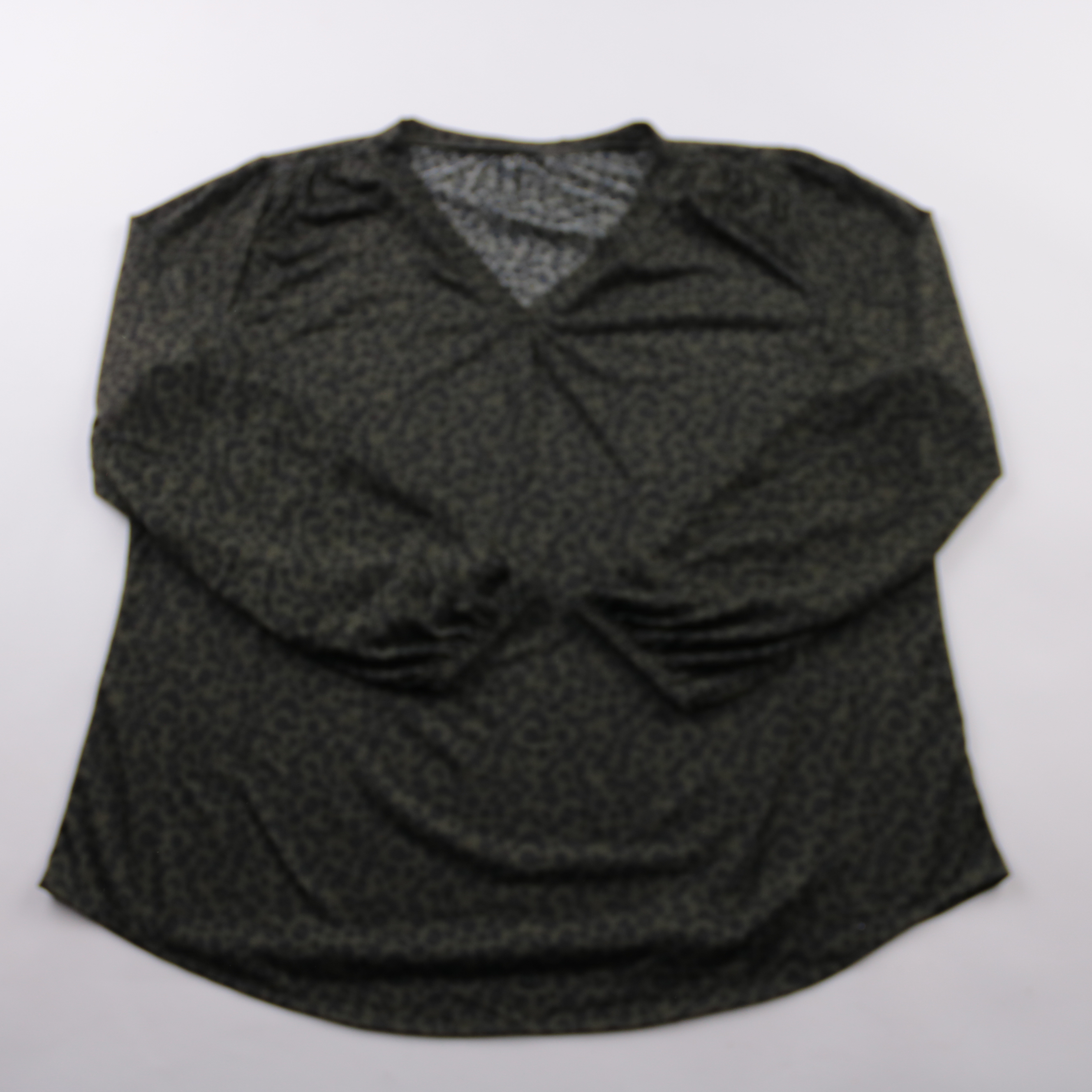 Блузка с длинным рукавом и V-образным вырезом, ткань с леопардовым принтом в тёмно-оливково‑чёрной гамме. Подойдёт для повседневных образов и офиса с базовыми брюками или джинсами. Лёгкий материал комфортно носить слоями под жакет или кардиган.