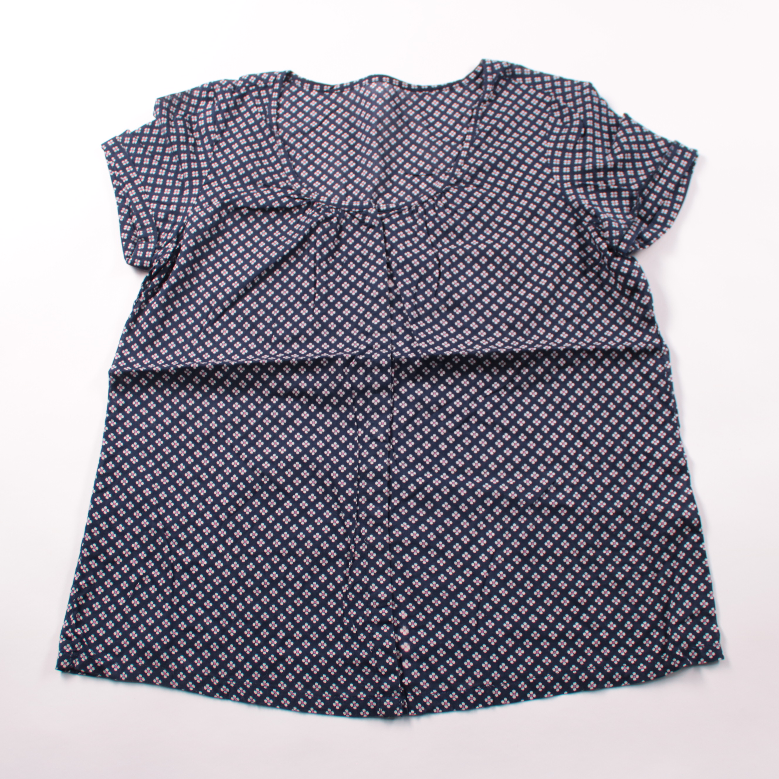 Женская блузка с коротким рукавом и мелким цветочным принтом на тёмно-синем фоне. Подойдёт для повседневных образов и офиса в тёплое время года, хорошо сочетается с джинсами и юбками. Лёгкая ткань комфортна в носке и не сковывает движения.