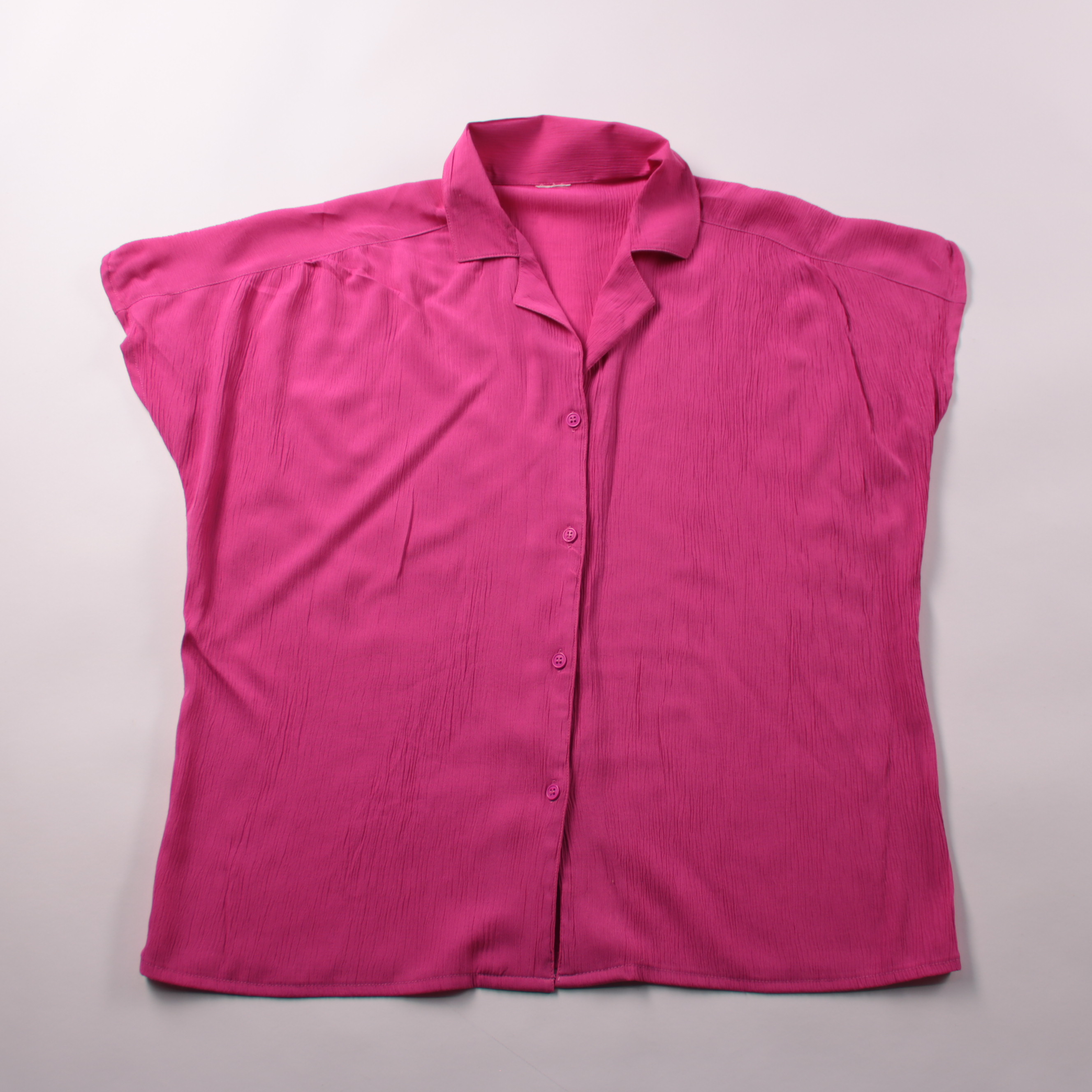 Лёгкая женская блузка ярко-розового цвета с коротким рукавом и застёжкой на пуговицы. Подойдёт для лета и тёплой погоды, хорошо сочетается с джинсами, юбкой или шортами. Практична тем, что тонкая ткань быстро сохнет и не утяжеляет образ.