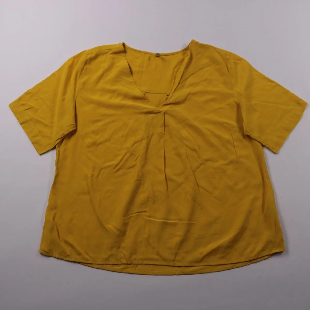 Женская блузка Hema горчичного цвета с коротким рукавом и V-образным вырезом со складкой спереди. Подойдёт для повседневных образов и офиса в тёплую погоду, легко сочетается с джинсами и юбками. Ткань на основе вискозы приятная к телу и хорошо драпируется.