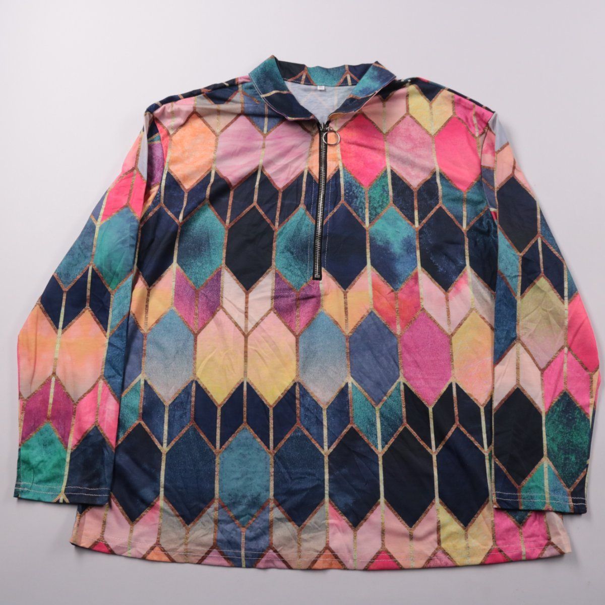 Яркая женская блузка с геометрическим разноцветным принтом и короткой молнией у горловины. Подойдёт для повседневных образов и встреч, хорошо смотрится с однотонными брюками или джинсами. Ткань тянется и не мнётся, поэтому удобна в носке и проста в уходе.