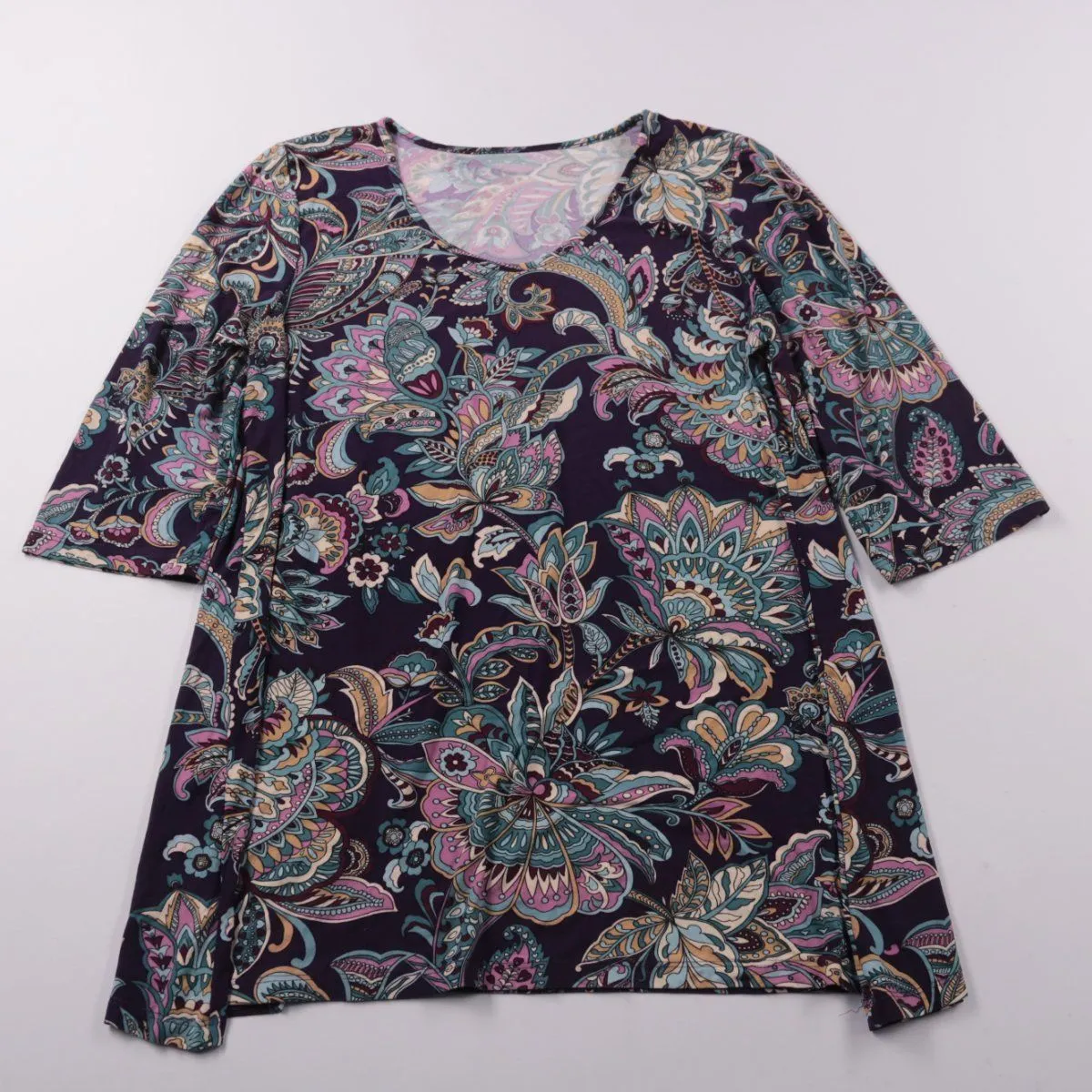 Женская блузка с ярким цветочным принтом на тёмном фоне и V-образным вырезом, рукав 3/4. Подойдёт для повседневных образов и офиса с однотонными брюками или юбкой. Практичный плюс — немаркий цвет и рисунок, который хорошо скрывает мелкие следы носки.