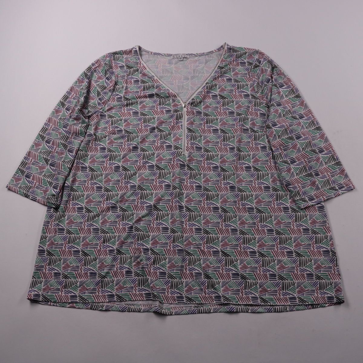 Женская блузка ODREY с геометрическим разноцветным принтом и V-образным вырезом на молнии. Подойдёт для повседневных образов и офиса с жакетом или кардиганом. Практична тем, что легко сочетается с однотонным низом и не требует сложного ухода.