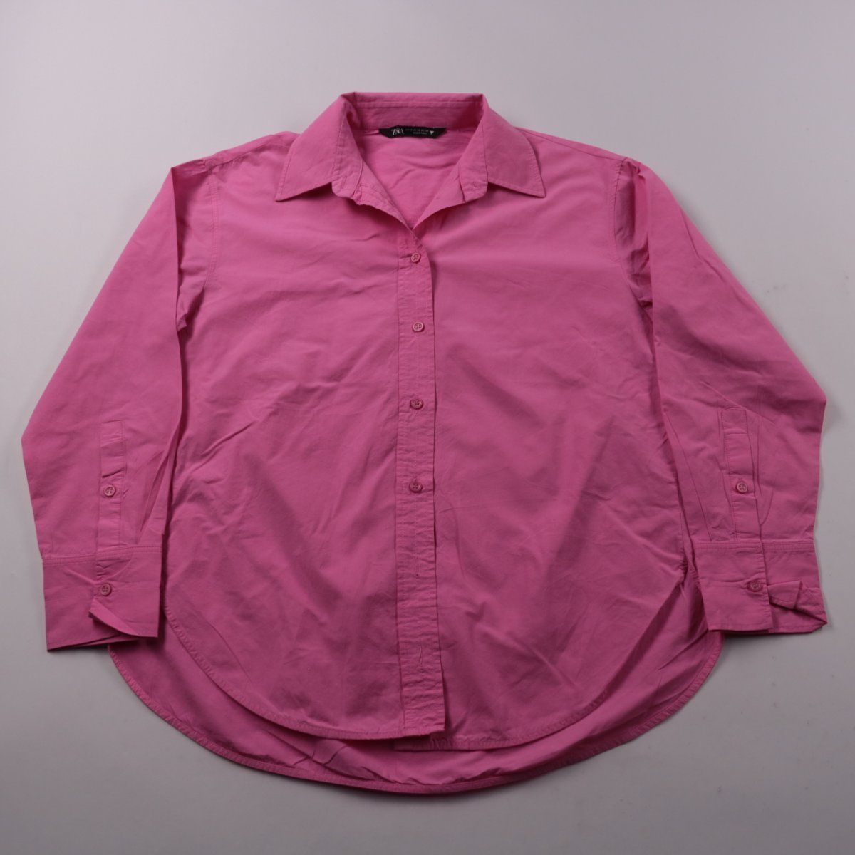 Женская рубашка Zara ярко-розового цвета с классическим отложным воротником и застёжкой на пуговицы. Подойдёт для офиса и повседневных образов, удобно носить как самостоятельный верх или вторым слоем. Натуральный хлопок хорошо дышит и комфортен в течение дня.