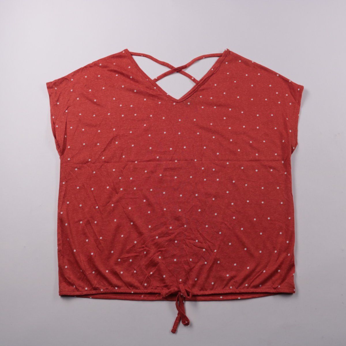 Женская блузка Gina Benotti красного цвета в мелкий белый горошек, с V‑вырезом и перекрёстными бретелями на спине. Подойдёт для тёплой погоды и повседневных образов с джинсами или шортами. Лёгкая вискозная ткань приятна к телу и хорошо дышит.