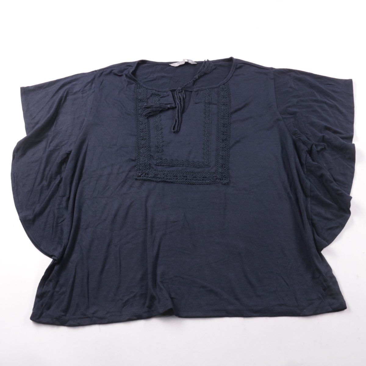 Блузка Katies тёмно-синего цвета с декоративной вышивкой/кружевной вставкой спереди и завязками у горловины. Свободный оверсайз-крой подойдёт для повседневных летних образов и отдыха. Смесовая ткань с вискозой мягкая и проще в уходе, чем полностью натуральные материалы.