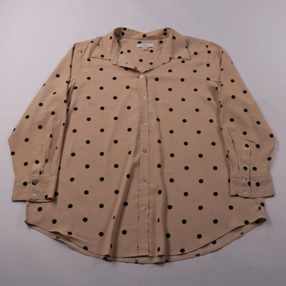 Блузка M&S бежевого цвета в чёрный горох, с отложным воротником и застёжкой на пуговицы. Подойдёт для офиса и повседневных образов, хорошо сочетается с однотонными брюками или джинсами. Лёгкий полиэстер почти не мнётся и быстро сохнет после стирки.