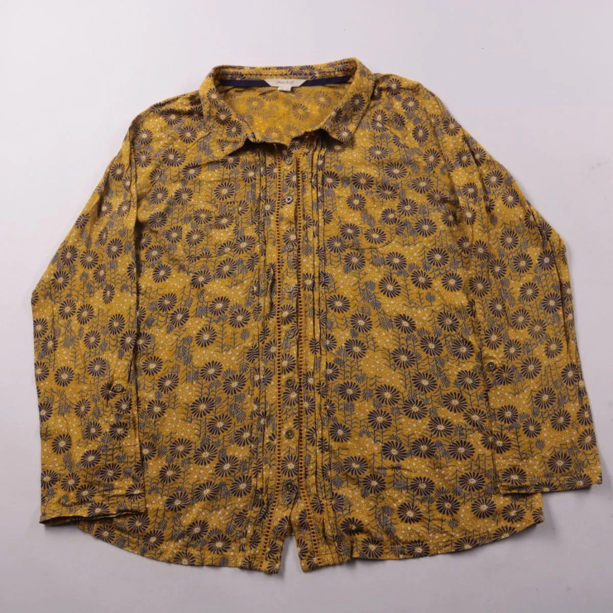 Женская рубашка White Stuff горчичного цвета с синим цветочным принтом и застёжкой на пуговицы. Подойдёт для повседневных образов и офиса в стиле casual. Натуральный состав с модалом приятен к телу и хорошо дышит.
